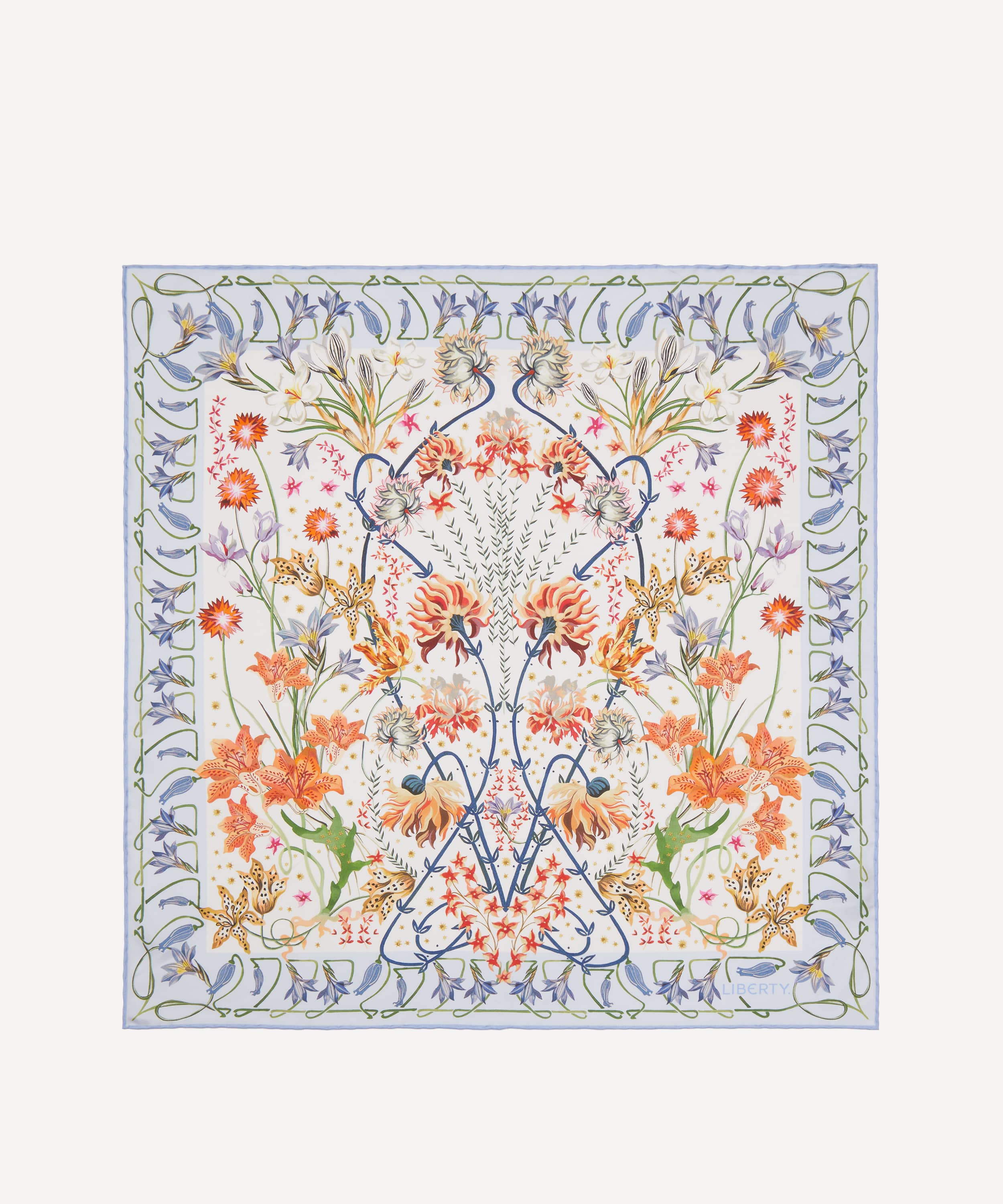 なめらかで上質なシルクツイルを使用し、イタリアで織り上げ・プリントされた本製品は、リバティを象徴する「アイアンシ・ ガーデン」プリントを採用。アール・ヌーヴォー様式のデザイン「アイアンシ」をもとに、1902年頃にフランス人アーティストR.ボークレールによって壁紙として描かれた原画を花柄モチーフで再解釈しています。鮮やかな色彩と生命感にあふれるこのスカーフは、首元に軽く結んで差し色にしたり、さらりと羽織ったり、髪に編み込んでアクセントにしたりと、さまざまなスタイリングをお楽しみいただけるタイムレスなアクセサリーです。