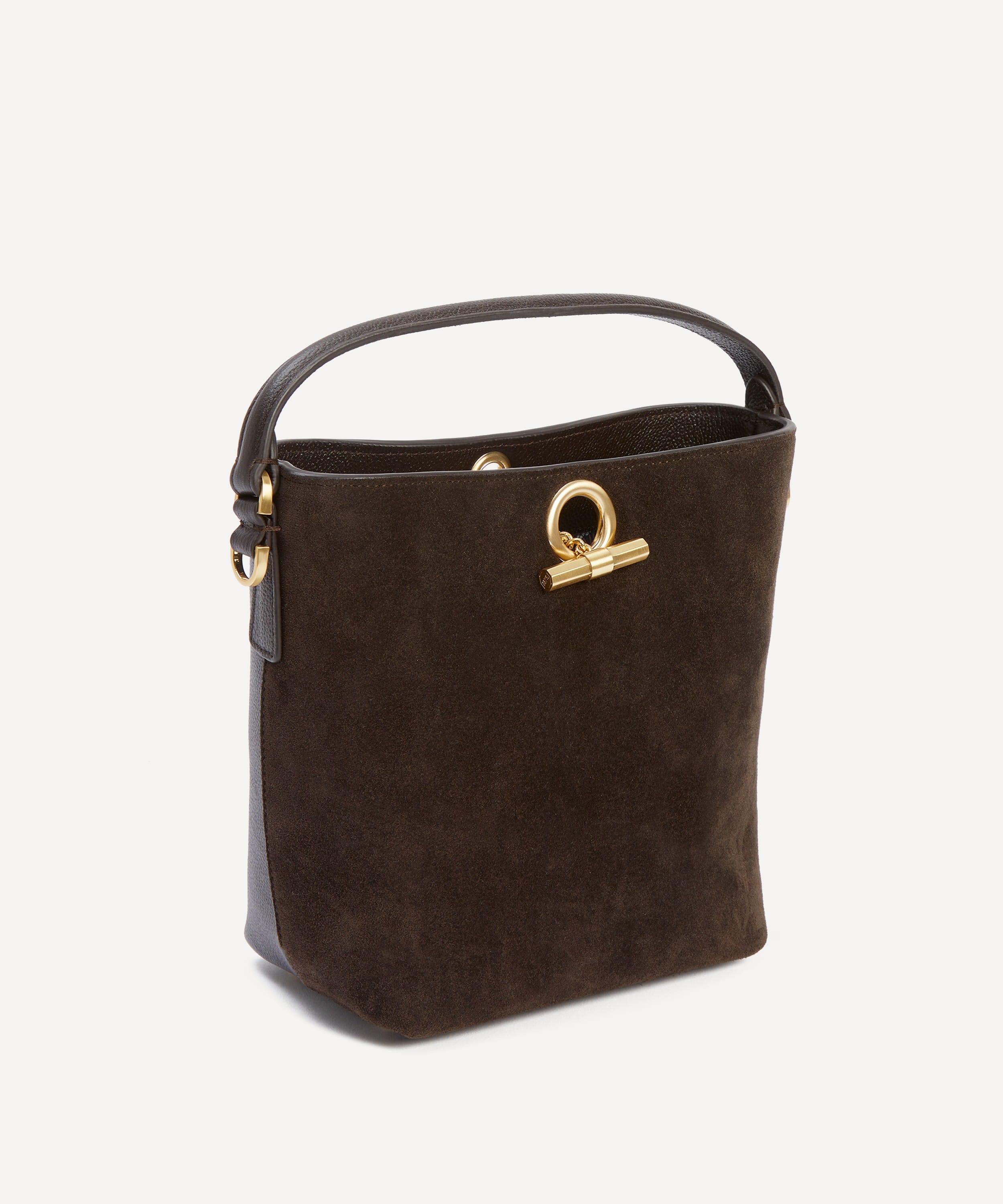 上質なスエードレザーを使用し、日常使いに適したバケットシルエットに仕上げました。見た目以上の収納力を備え、チューダー様式の建築に見られる煙突から着想を得たTバー&チェーンロックが、印象的なアクセントを添えています。