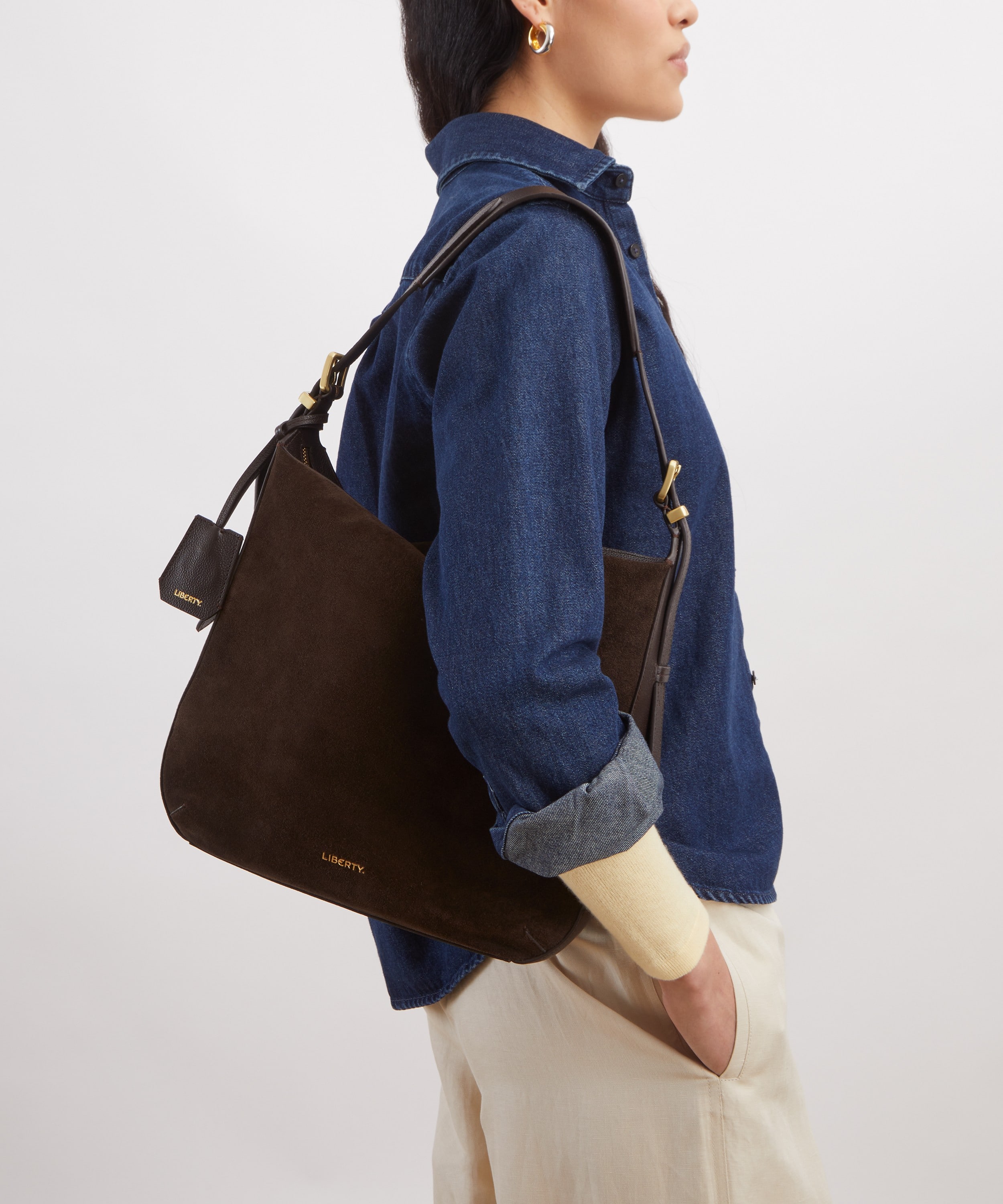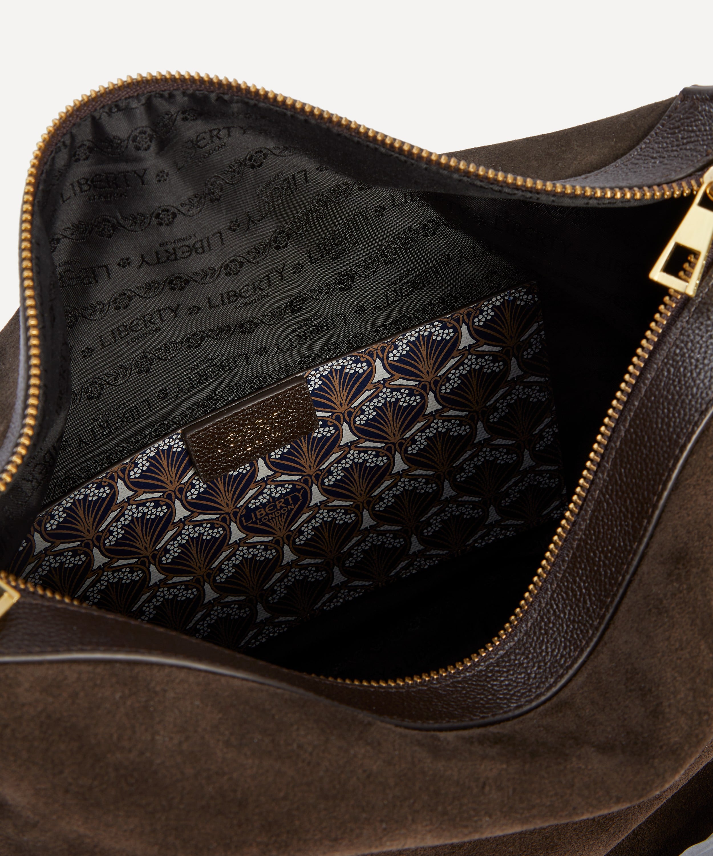 スエード ホーボーバッグ / コットンリネントリム / アイフィスプリント キャンバスの内ポケット / ダブルファスナー開閉 / 取り外し可能なラゲッジタグ / 調節可能なストラップ / リバティロゴ入り金具 / お手入れ方法:研磨剤を含まない乾いた布で優しく拭いてください