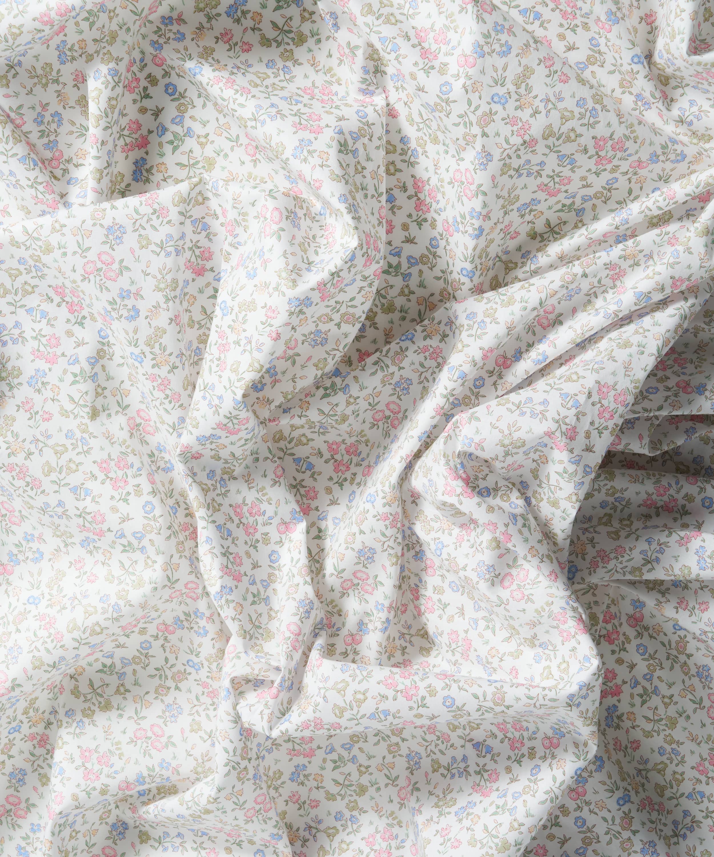 1936年に遡るリバティのアーカイブブックの中で見出された「メドゥ・スウィート」は、ブランドの本質ともいえるスタイルを体現した、魅力あふれるフローラルプリントです。春の小さな花々が一面に散りばめられ、デイジーやブルーベル、ほころび始めた蕾が、繊細な草の房に寄り添うように描かれています。どこか懐かしさを感じさせる情景が、穏やかで詩的なタペストリーのように広がります。