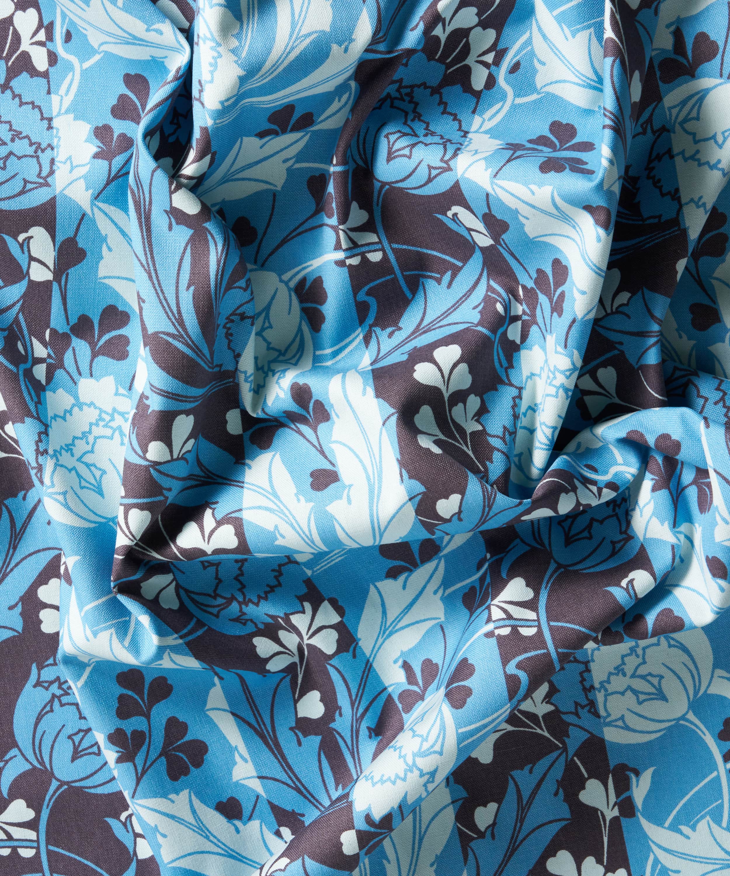 リバティのアーカイブから発見されたアール・ヌーヴォーのアートワークをベースにした、「部分的な繰り返し」のコンセプトを体現するチューリップと葉の印象的なデザインです。手描きパートが部分的に彩色され、鉛筆で描かれた部分や 「未完成」の部分と並べられ、最終的なプレビューの役割を果たします。鮮やかなストライプがカラーブロッキングの概念を大胆に取り入れ、印象的なポジとネガのシャドー効果によって強調された超モダンな美学を表現しています。
