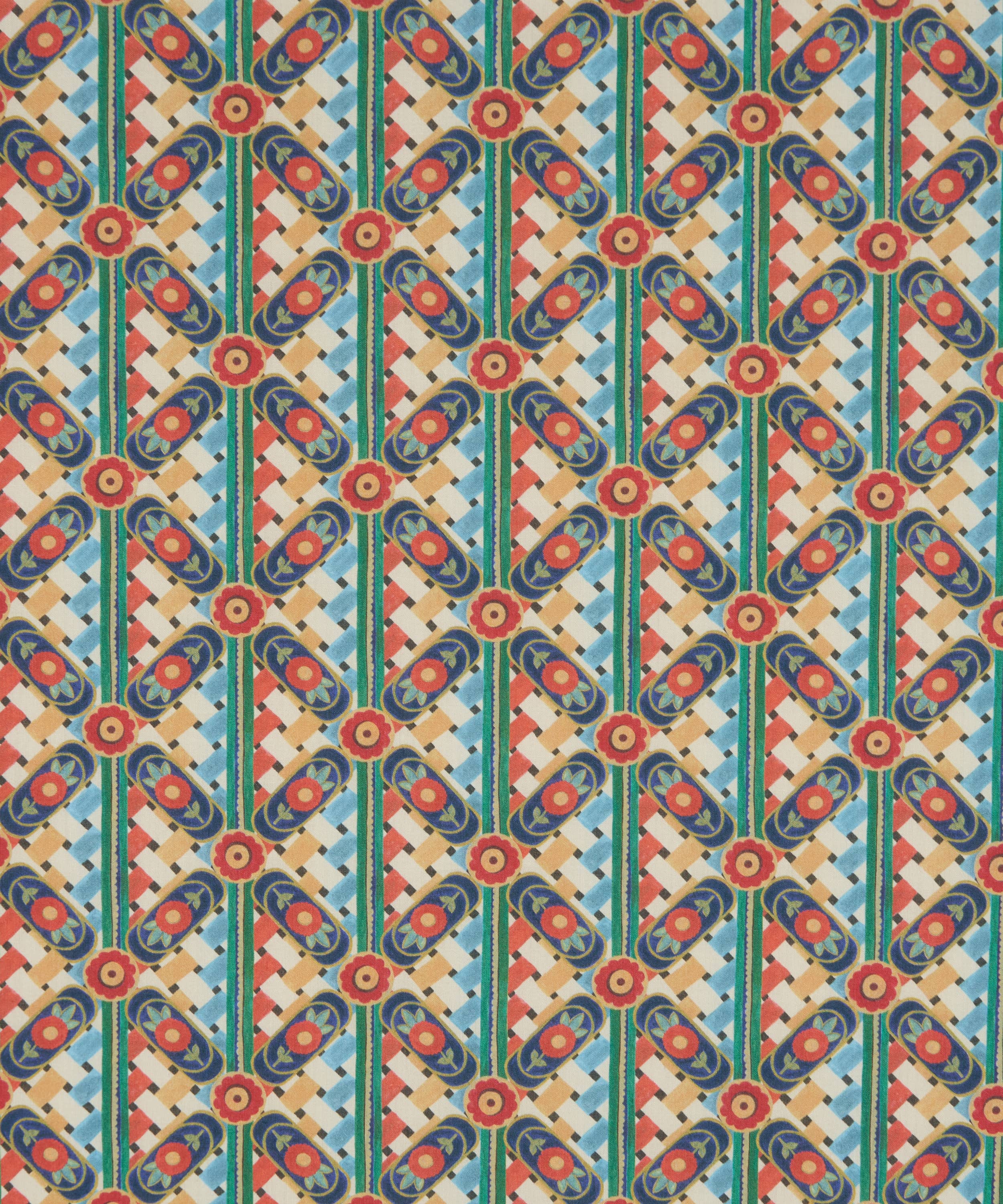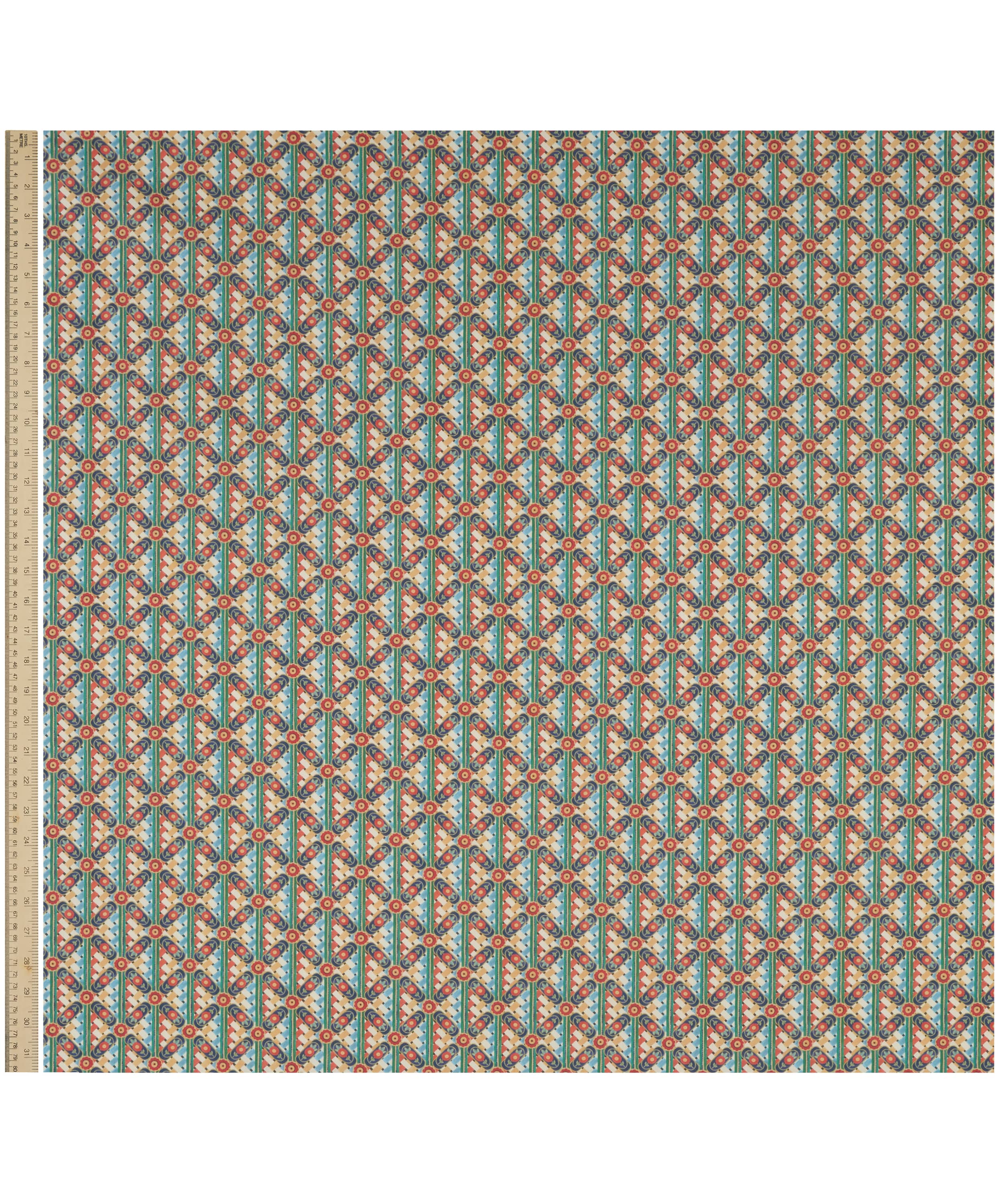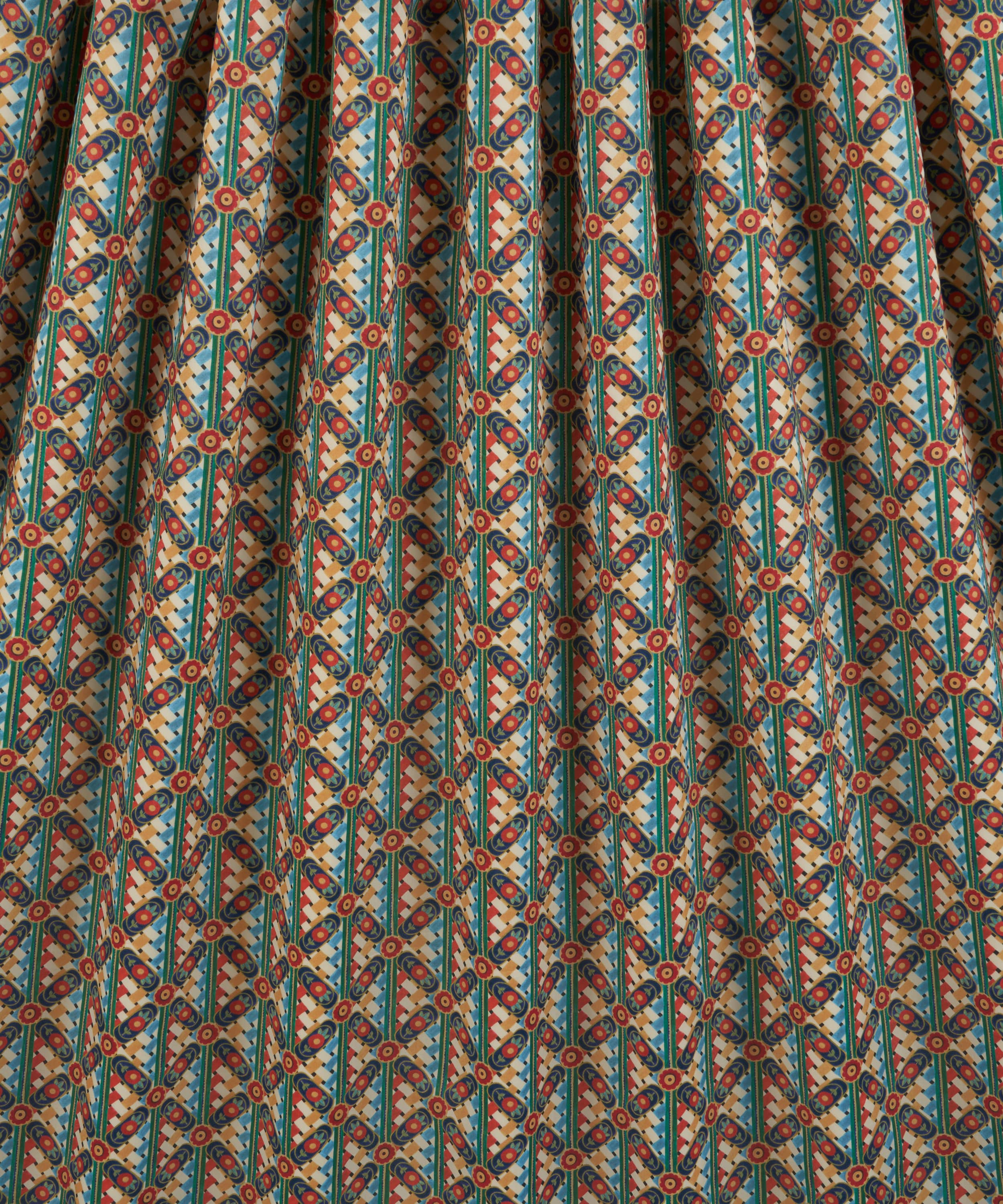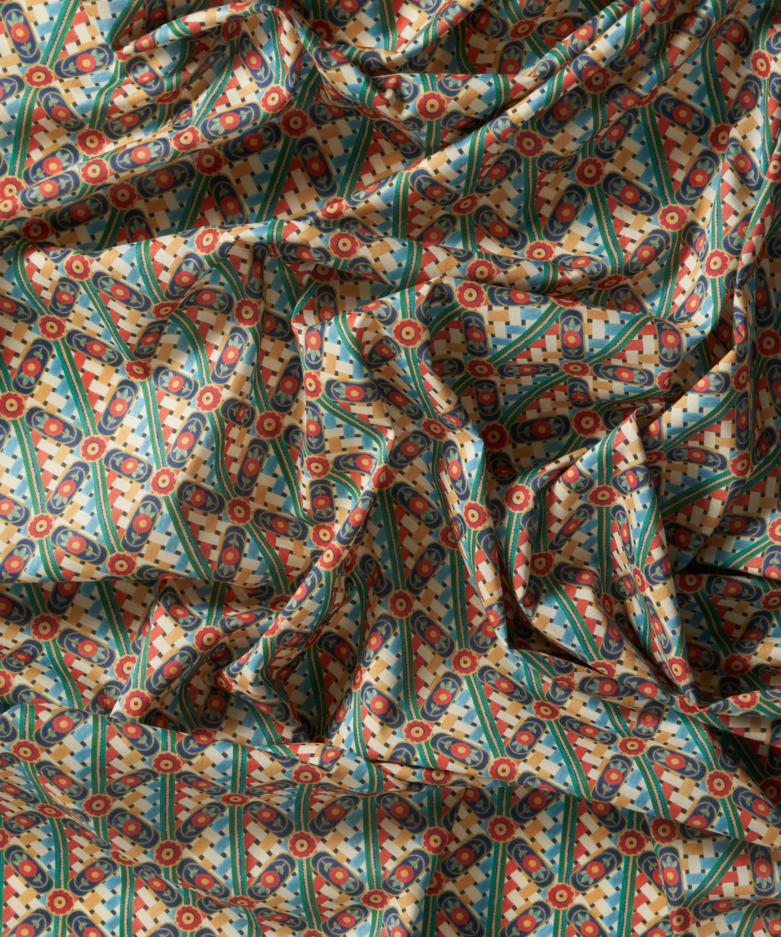 「ノコ・ウィーブ」は、1971年のリバティ・アーカイブスカーフに着想を得て、幾何学模様と繊細な花柄を見事に融合させたデザインです。複数のアーカイブデザインから重ねられた要素が、斜めに走るチェッカーパターンを生み出し、深みと複雑さを加えています。リバティのスタジオで質感豊かなガッシュ絵具を用いて手描きされたこの柄は、籠細工のような緻密な職人技を感じさせます。