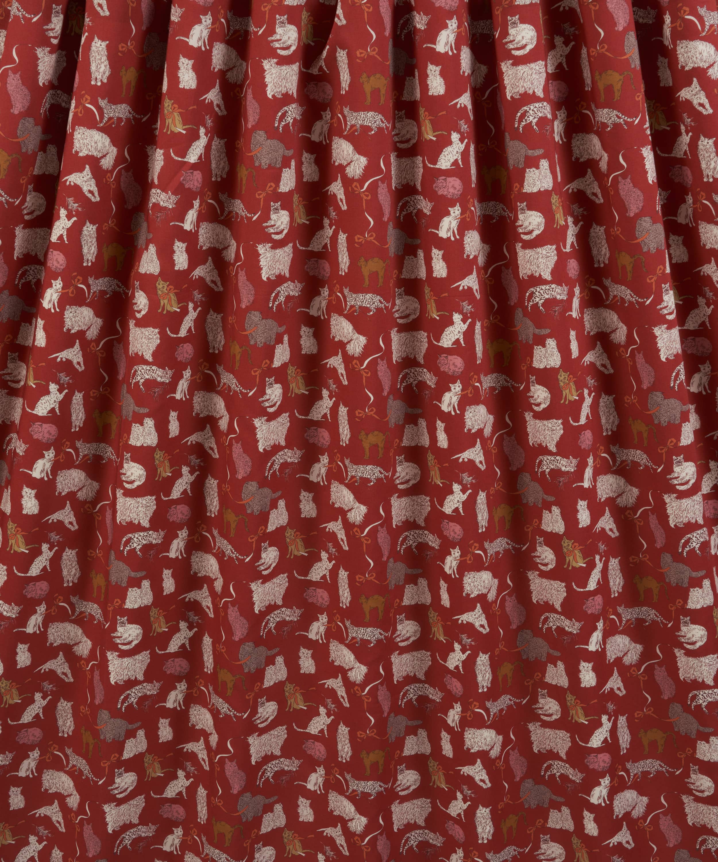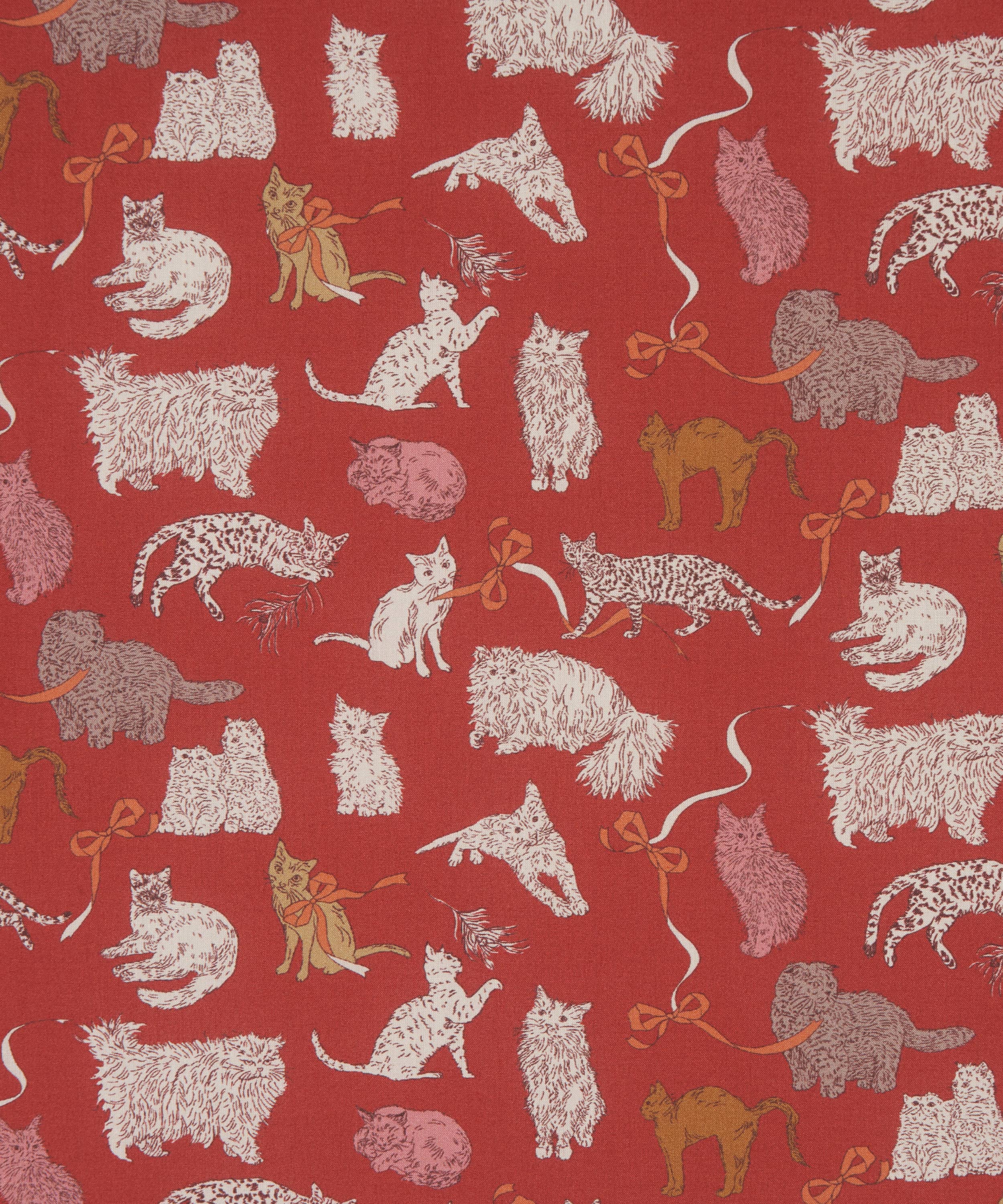 愛らしいキャラクター豊かな猫たちが、遊んだりくつろいだり、思い思いに動き回る会話のようなパターンです。リバティの人気デザイン「ミャウ(Meow)」から着想を得たこの新たな作品は、日本と英国のリバティスタッフが実際に飼っている猫たちをモチーフにしています。鉛筆で描かれたイラストは、リボンや蝶結びの間を遊び回る猫たちの愛らしい仕草と、自由でユーモラスな個性を見事に捉えています。