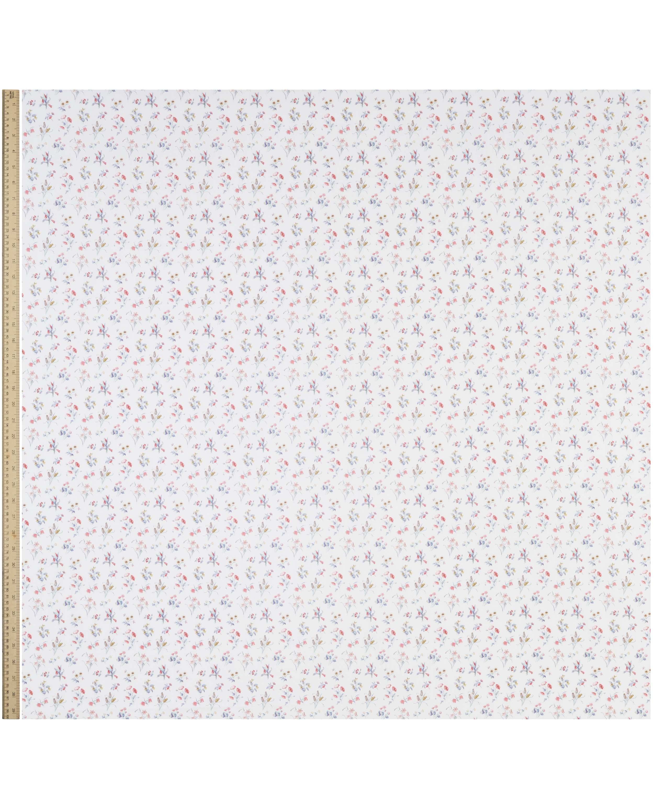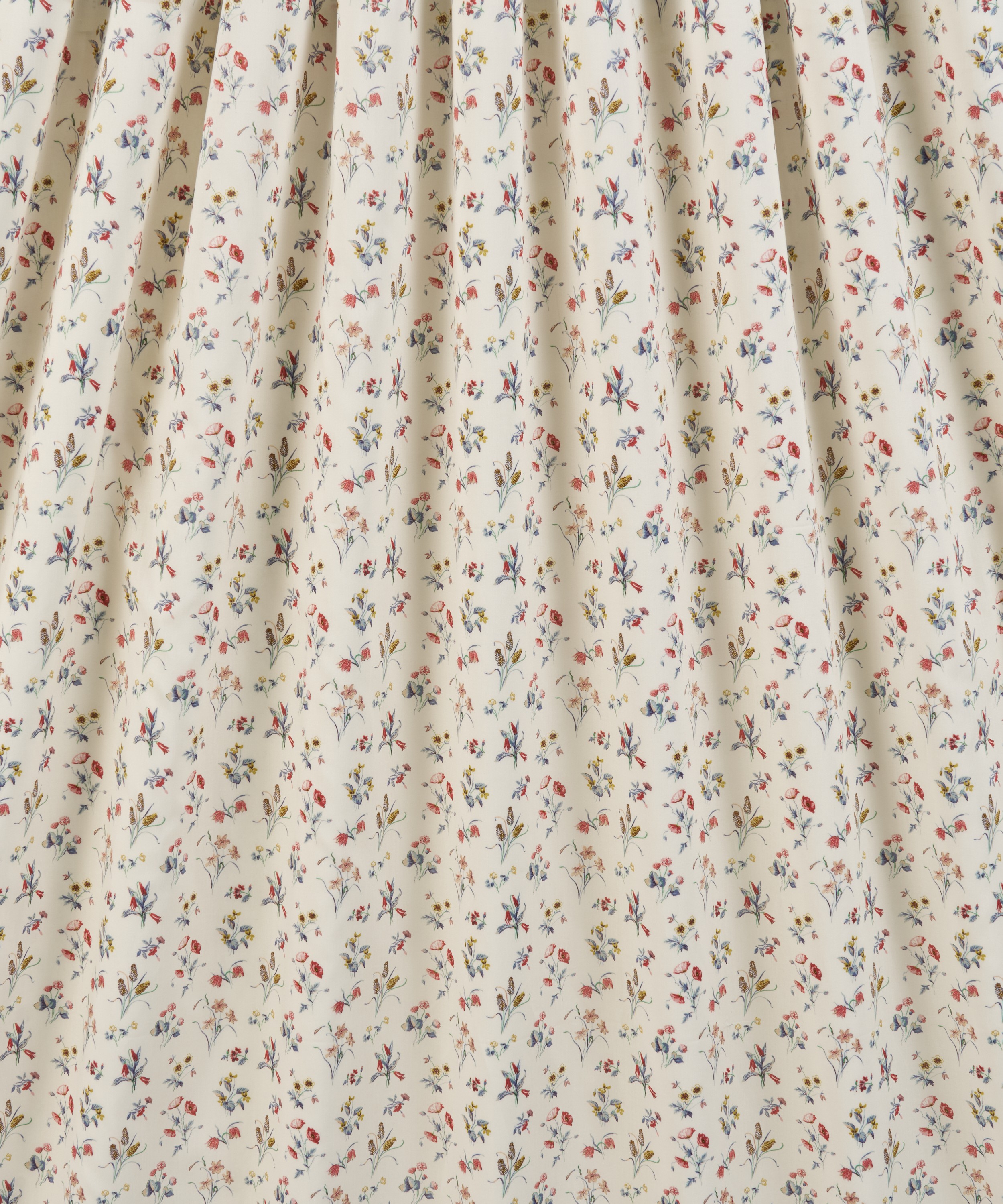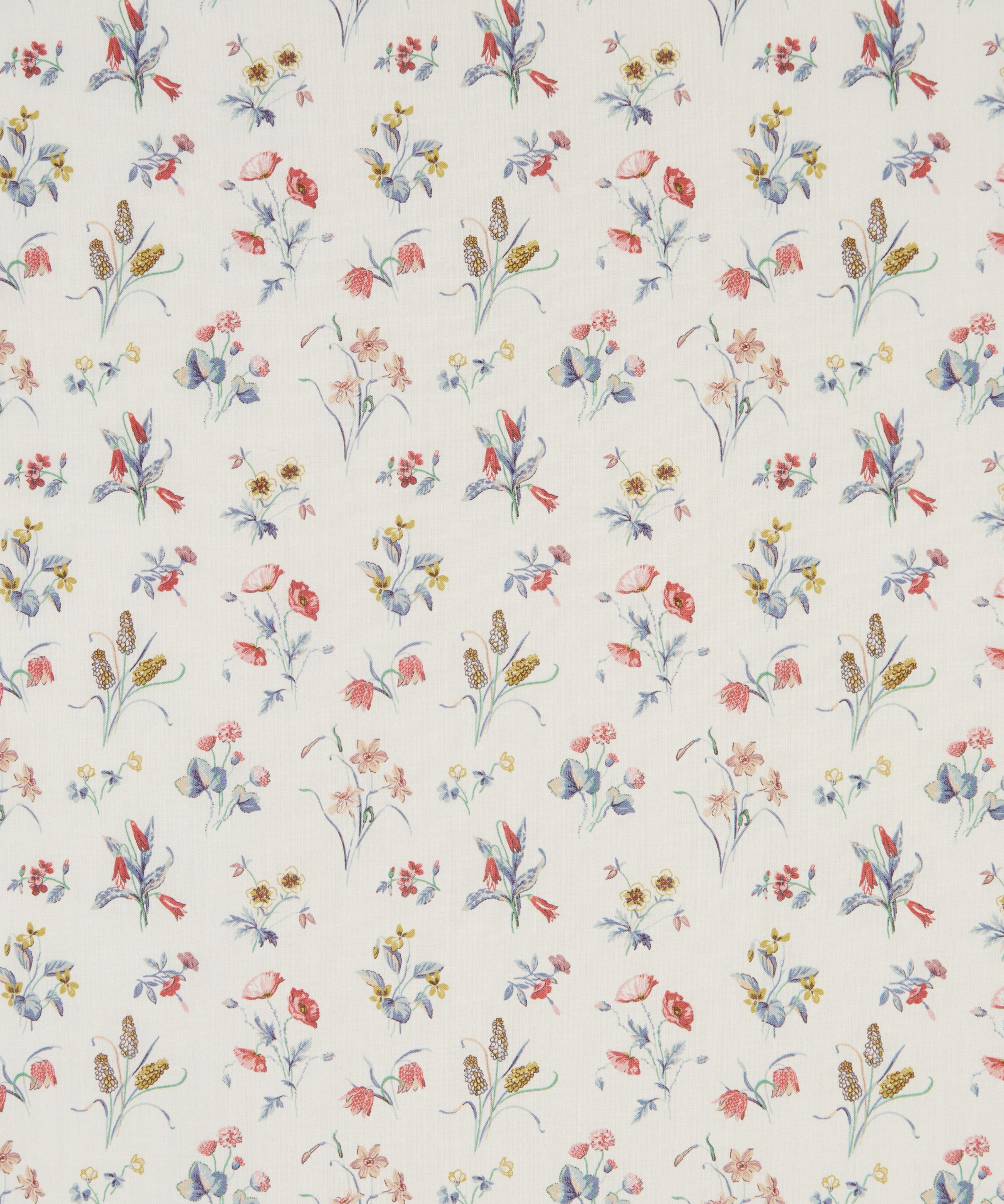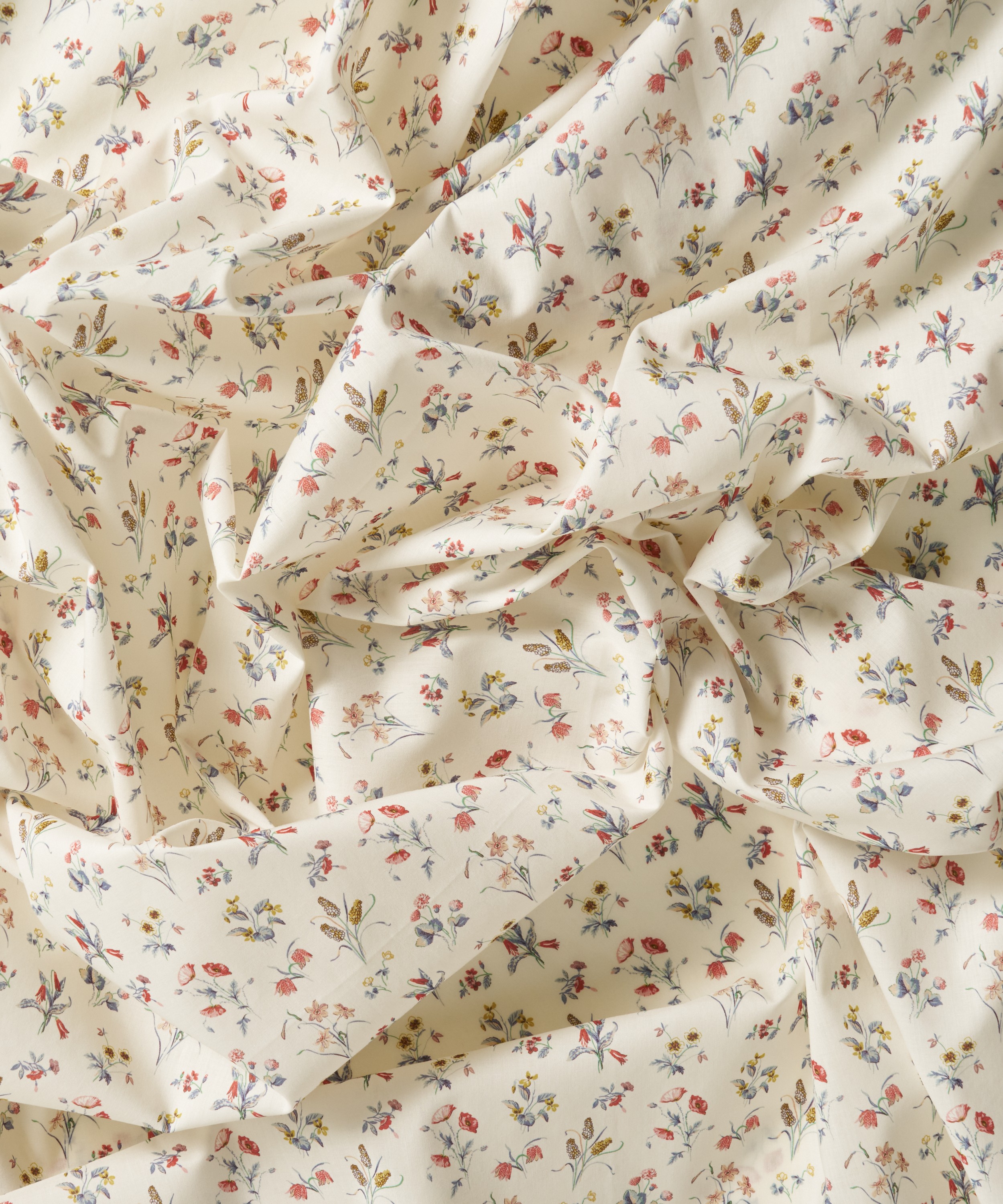 リバティのアーカイブに残るハンドペイントのアートワークに着想を得たデザインです。フリティラリアやポピー、ツリガネソウ、スイセン、ヒヤシンスといった季節の可憐な花々が軽やかに散りばめられ、春の草原のやわらかな空気感を表現しています。繊細なディテールで描かれた優美な小花は、色調の微妙な変化を映し出し、それぞれの花のやわらかな陰影を際立たせています。