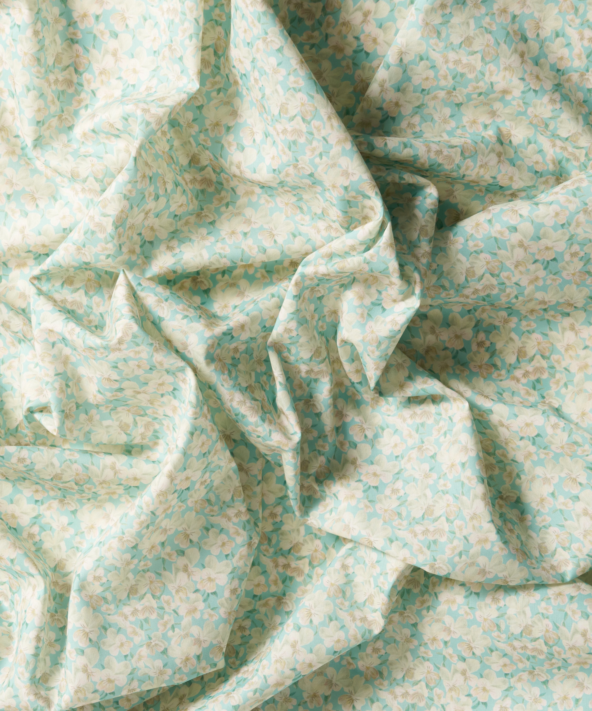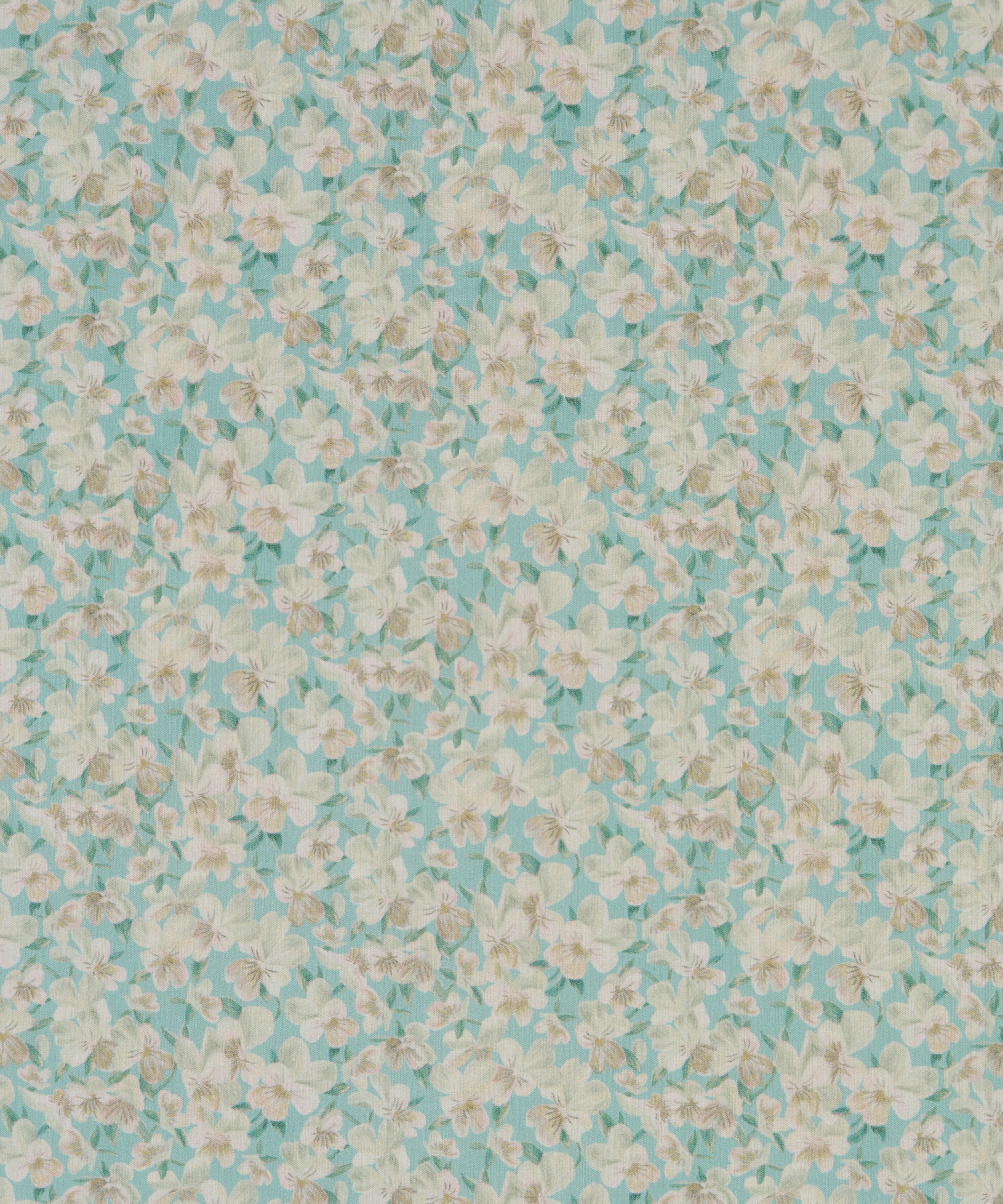 リバティのスタジオで、発色豊かな色鉛筆を用いて手描きされたデザインです。パンジーとビオラが一面に咲き広がるボタニカルパターンを描き出し、そのやわらかな花びらが布の上を舞うように表現されています。繊細な陰影と重ねられた色彩によって、これらの親しまれてきた花々が持つ、儚くも美しい表情とベルベットのような質感を丁寧に捉えています。