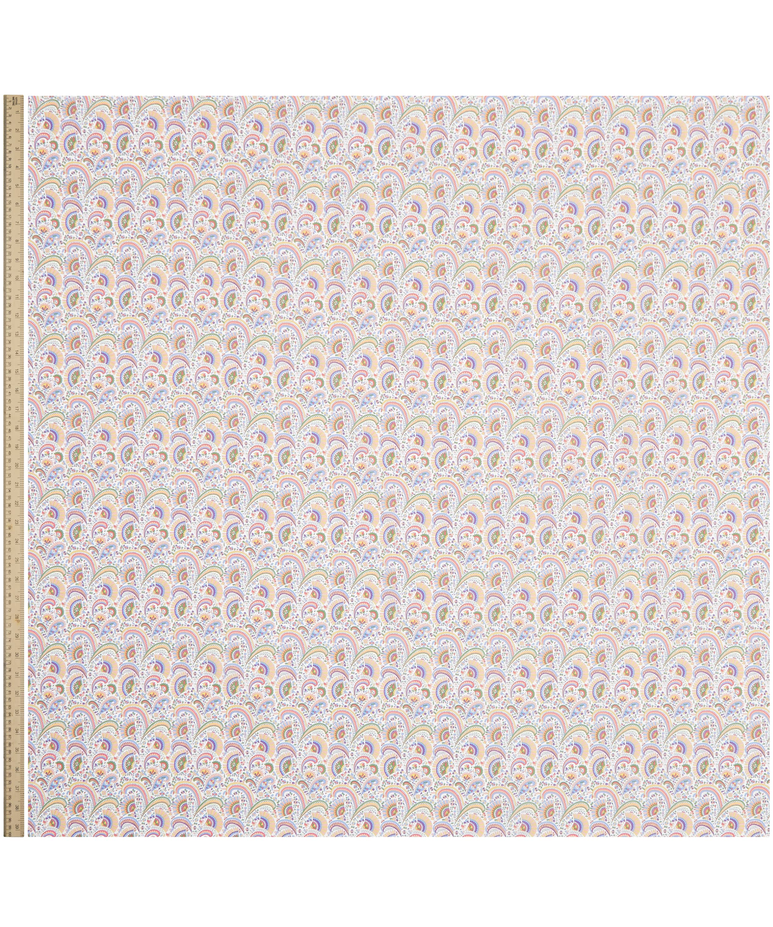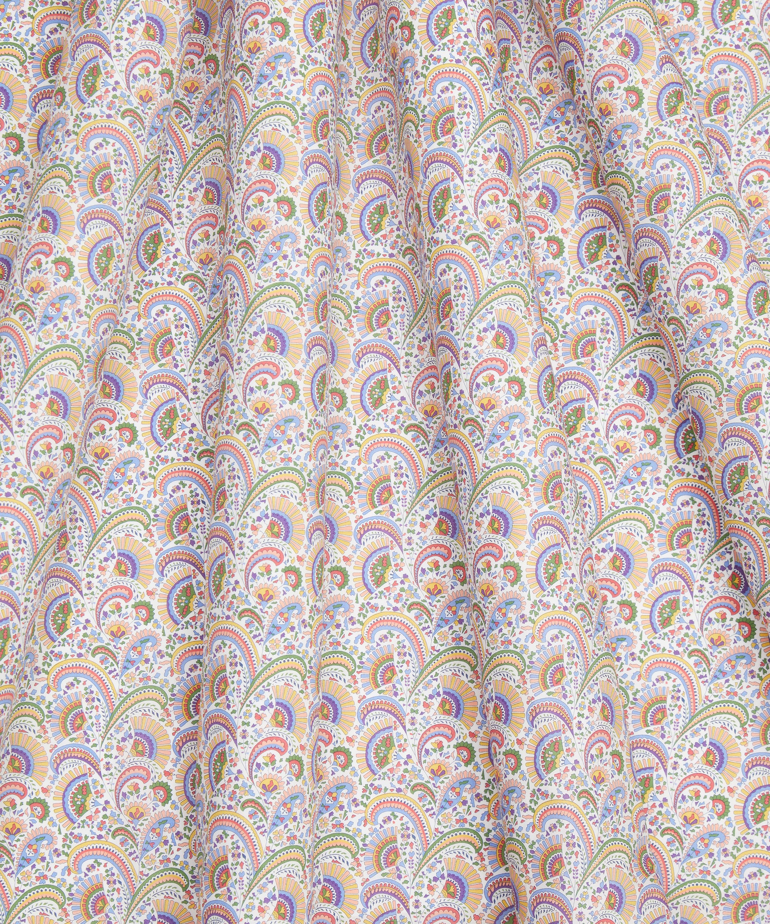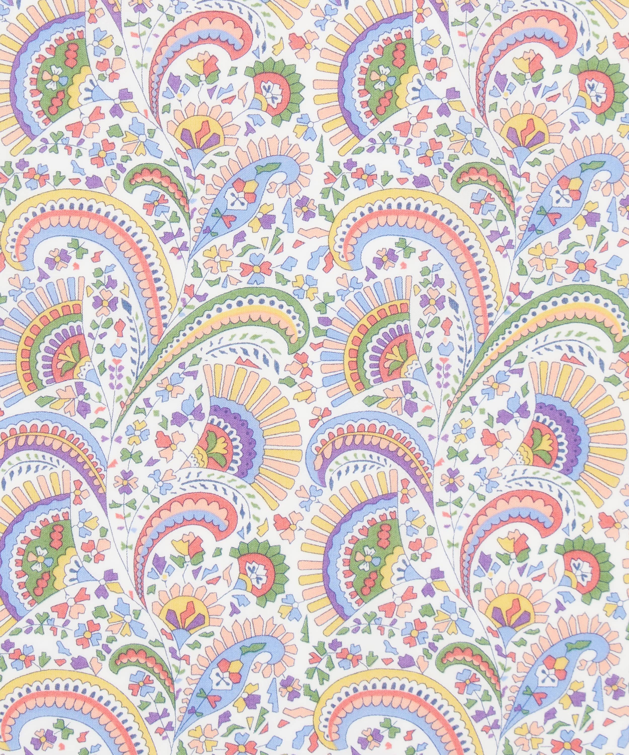 1860年代に遡るリバティのアーカイブ本から発掘された「ジャスヴィンダー」は、伝統的なペイズリースタイルからインスパイアされています。リバティのデザインスタジオにて細いラインペンで繊細に再描画されたこのプリントは、さまざまなペイズリー・フラワーの要素を組み合わせ、喜びと祝祭感を感じさせるファンファーレのような背景を作り出しています。
