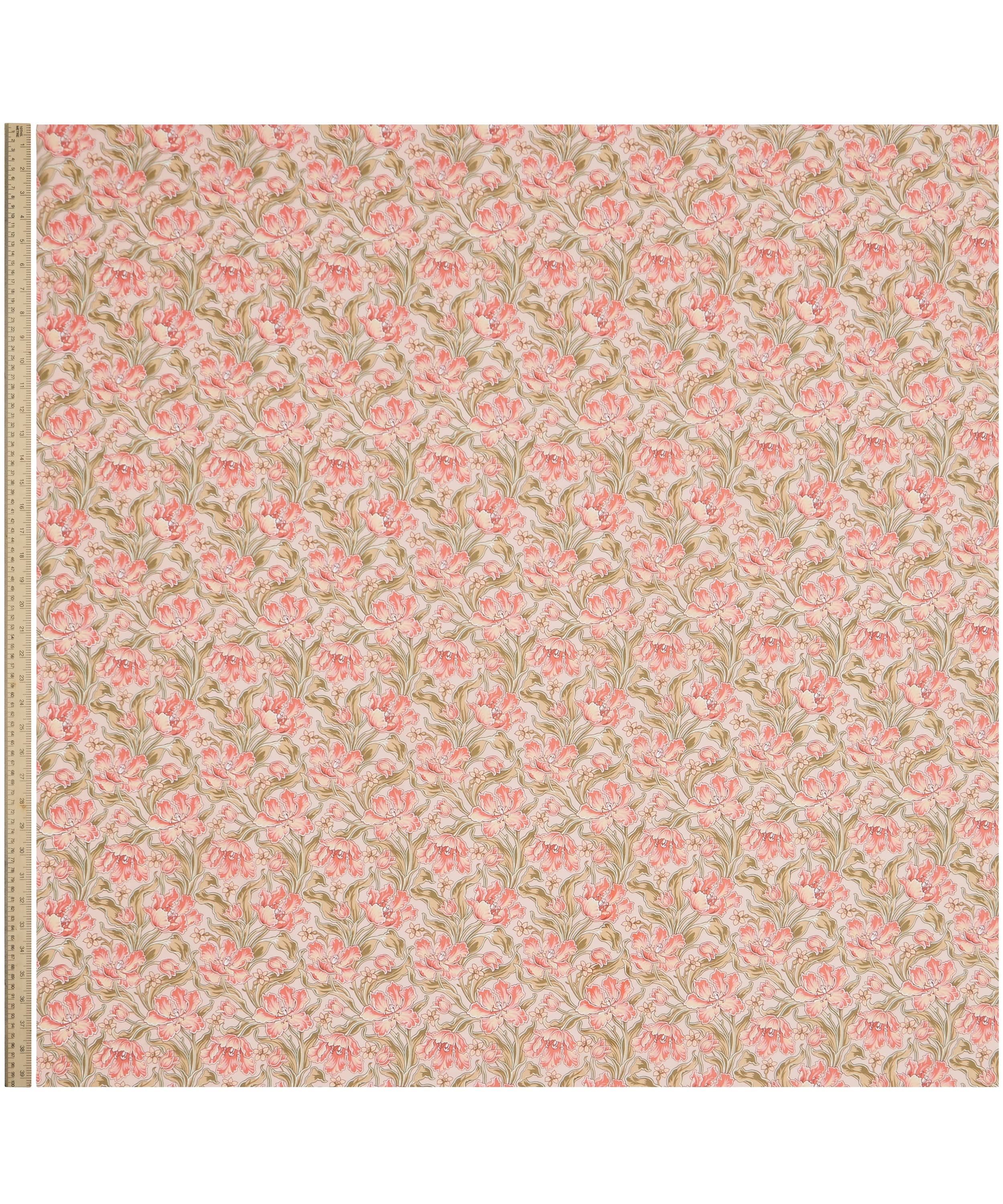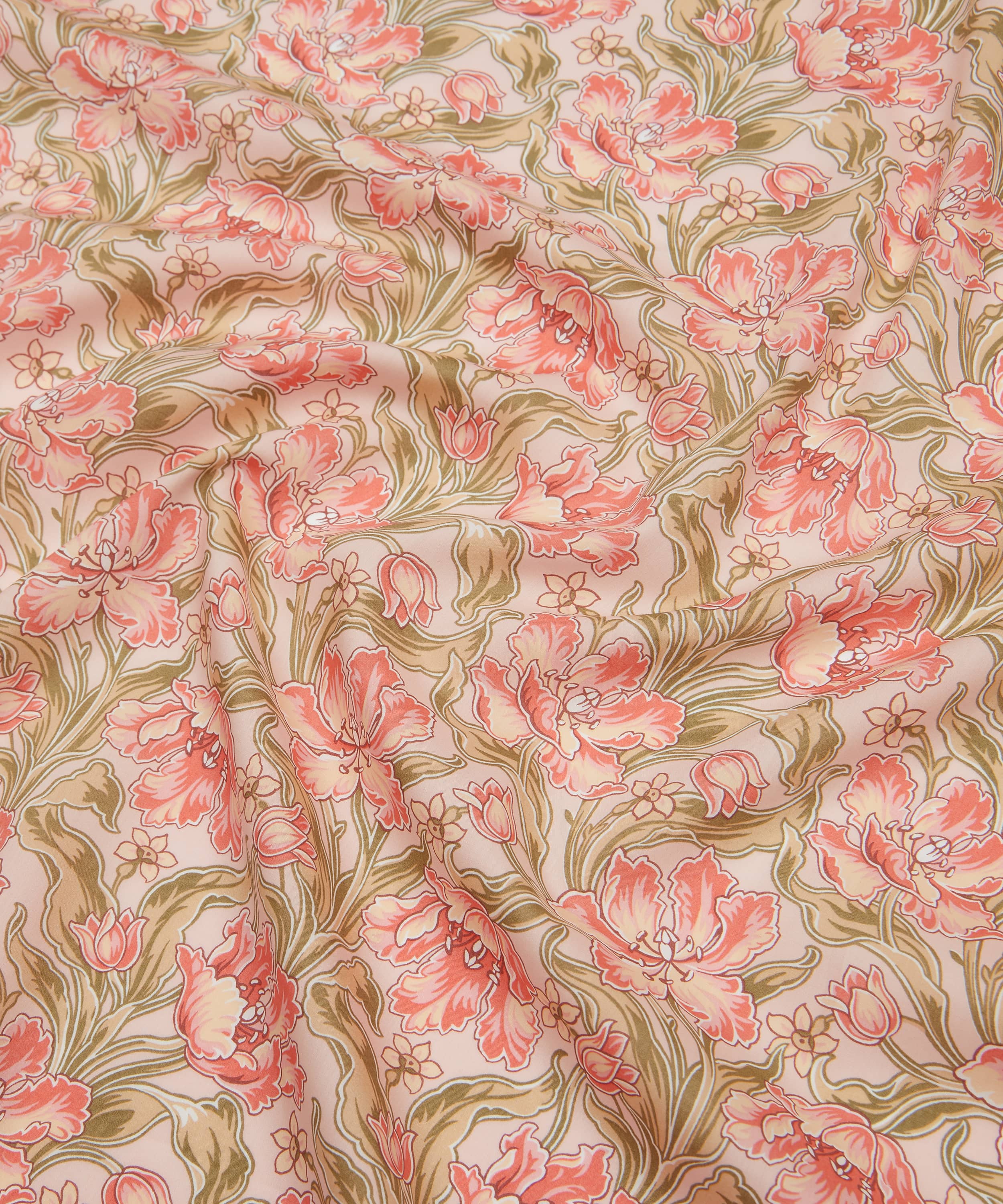 リバティ・アーカイブから発見された手描き作品を元にした「アーカイブ・チューリップス」は、リージェンシー・スタイルのチューリップが優雅に並ぶ印象的な植物デザインです。鮮やかな波状のラインで縁取られ、対照的な影で色付けされたこの構図は、豊かな背景色によってさらに引き立てられています。