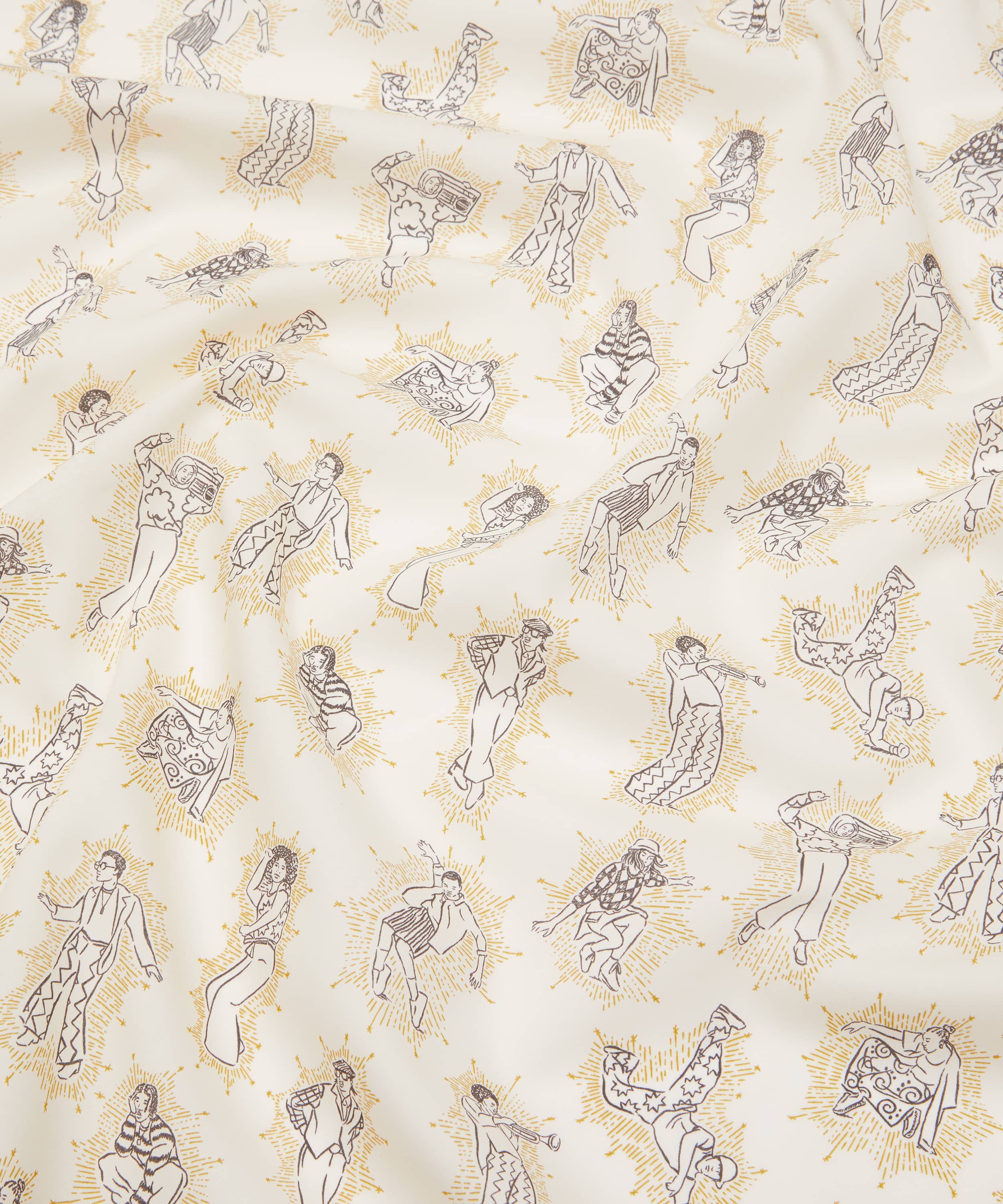 ファッションと音楽の深い結びつきからインスパイアされたダイナミックで表現力豊かなこのプリントは、ヒップホップとジャズの活気に満ちたサブカルチャーから影響を受けています。リバティデザインスタジオで手描きされたこのユニークでカンバセーショナルなプリントは、音楽のビートに合わせて流れるように動く想像上のダンサーたちを表現しています。