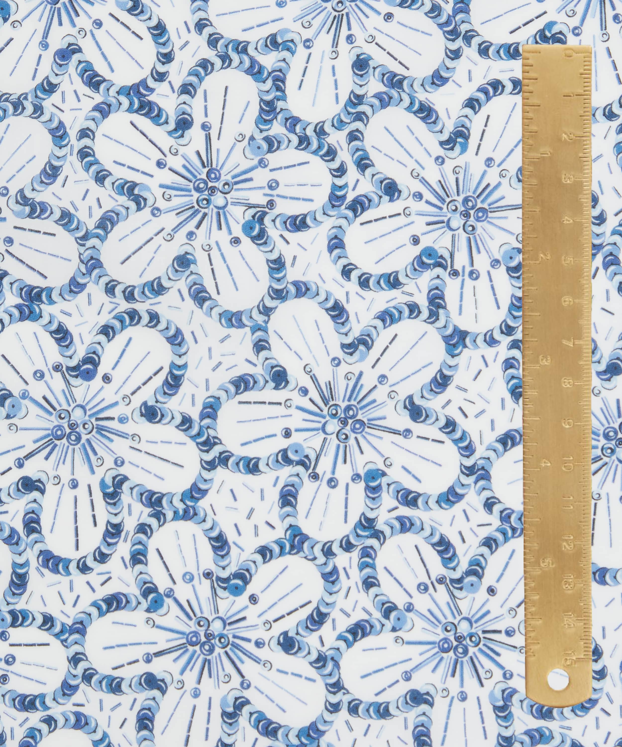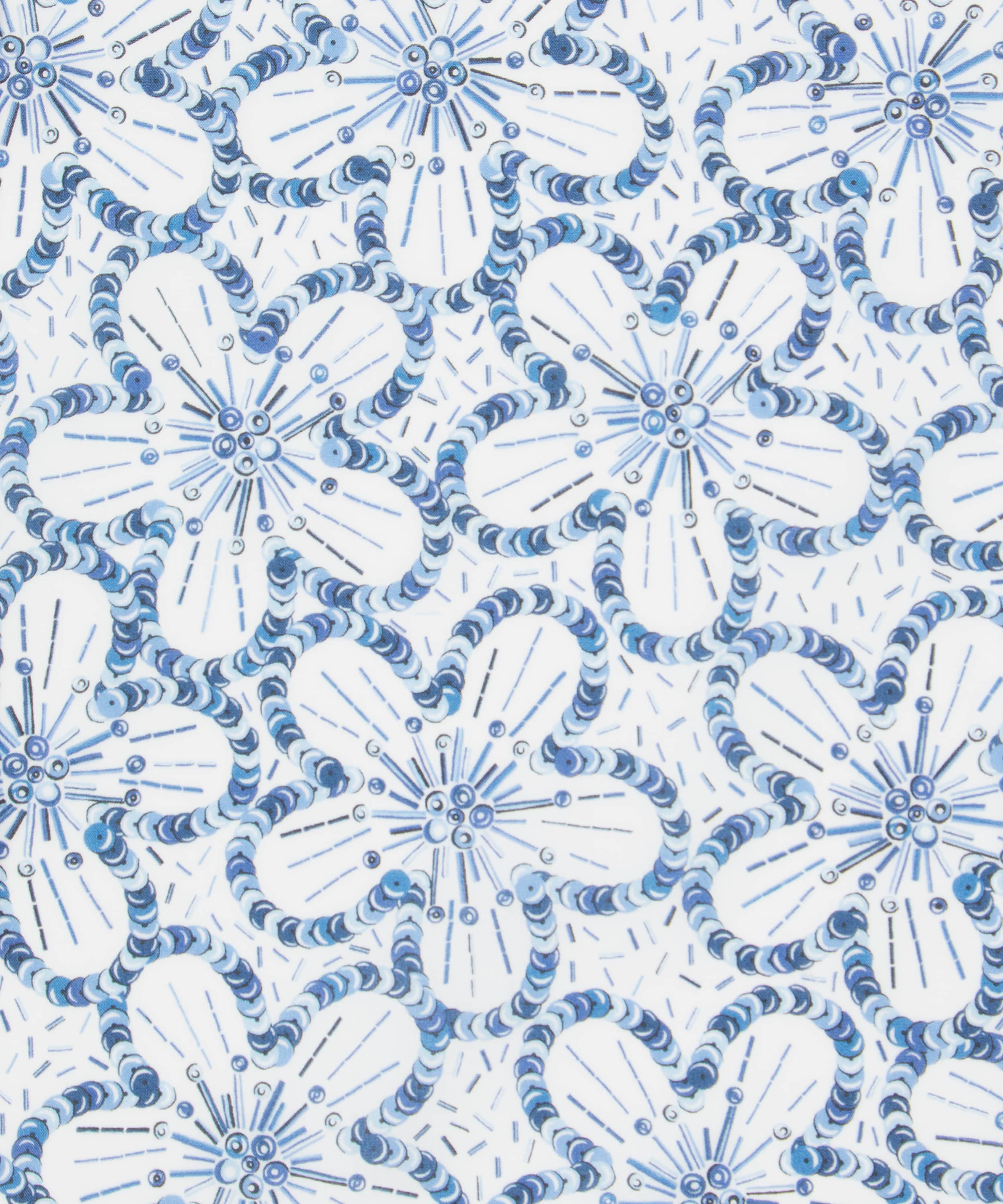 1910年代から1920年代における伝統的な制約からの解放を象徴するように、「フラッパー」として知られる若い女性たちは髪をボブにし、スパンコール、ビーズ、タッセルで飾られた短いドレスを着ていました。ガッシュで手描きされたこのデザインは、スパンコールで装飾された花びらが微妙なトロンプルイユ効果を生み出しています。このデザインは、きらめくフラッパードレスの魅力的な魅力を呼び起こします。