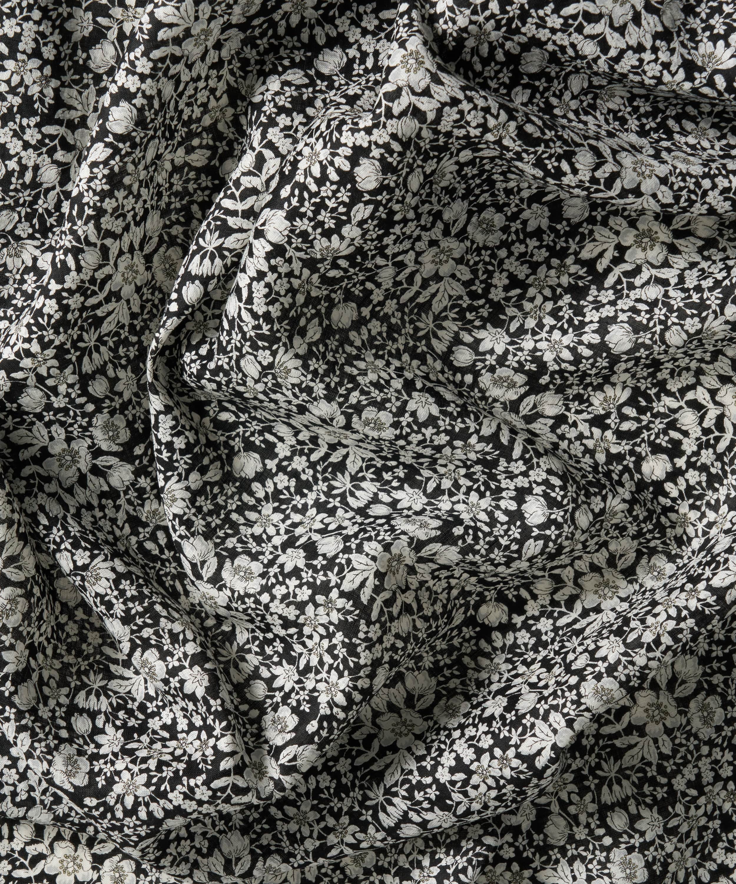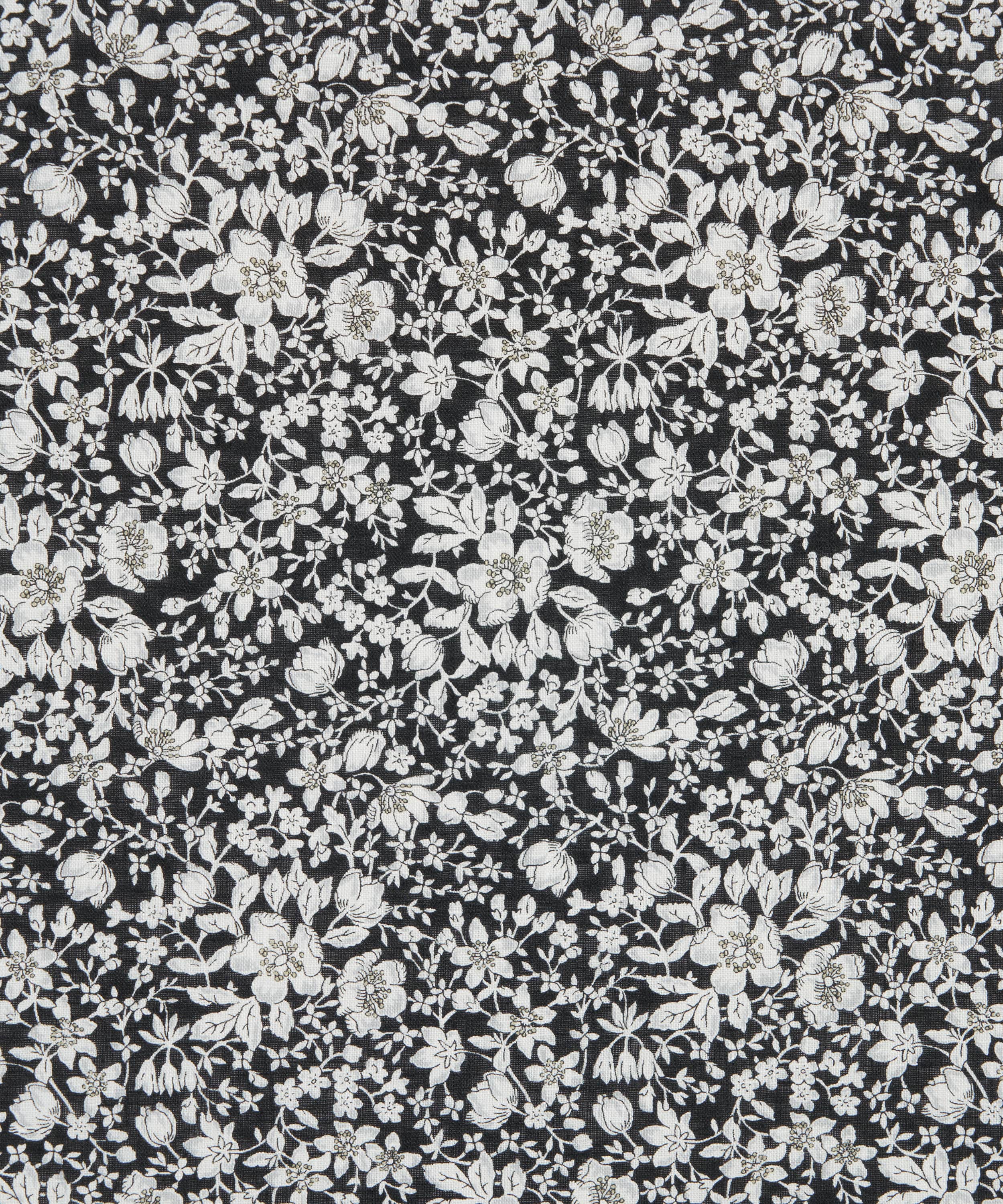 1939年にリバティによって描かれた時代を超えて愛される花柄「リジー」は、モノクロの陰影と繊細な輪郭が色付きの背景に映えています。細やかな花やつぼみ、バラの蔓がまるできらめく光やぶら下がる宝石のように輝き、控えめながらも洗練された魅力を放っています。
