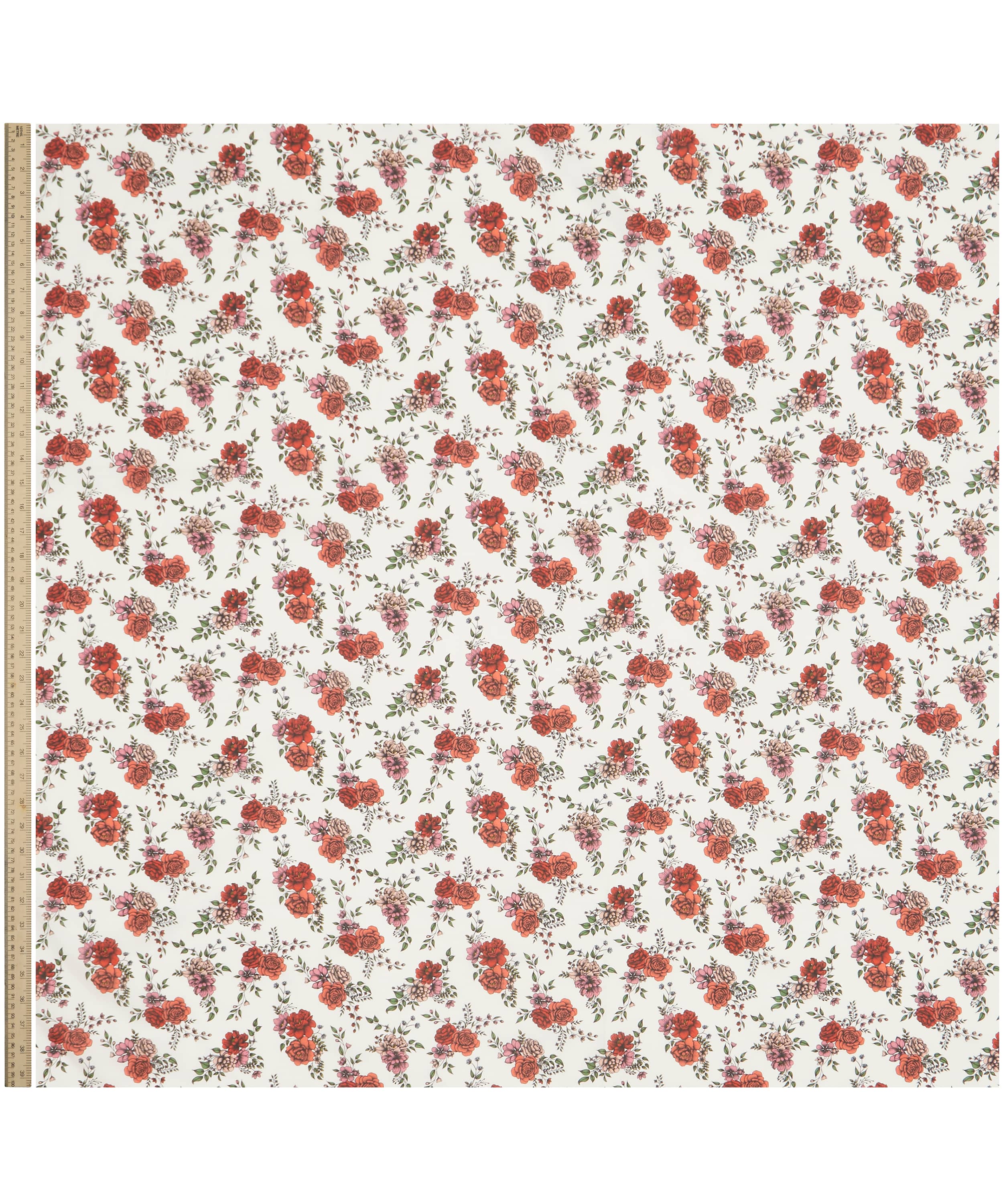 リバティデザインスタジオでファインライナーペンを使って手描きされたタトゥースタイルのつるが絡まった花柄のプリントです。タトゥーアートの繊細な針跡を彷彿とさせるこのデザインでは、バラとシャクヤクの花束が布の上を浮かぶように散りばめられ、多方向に繰り返し配置されています。