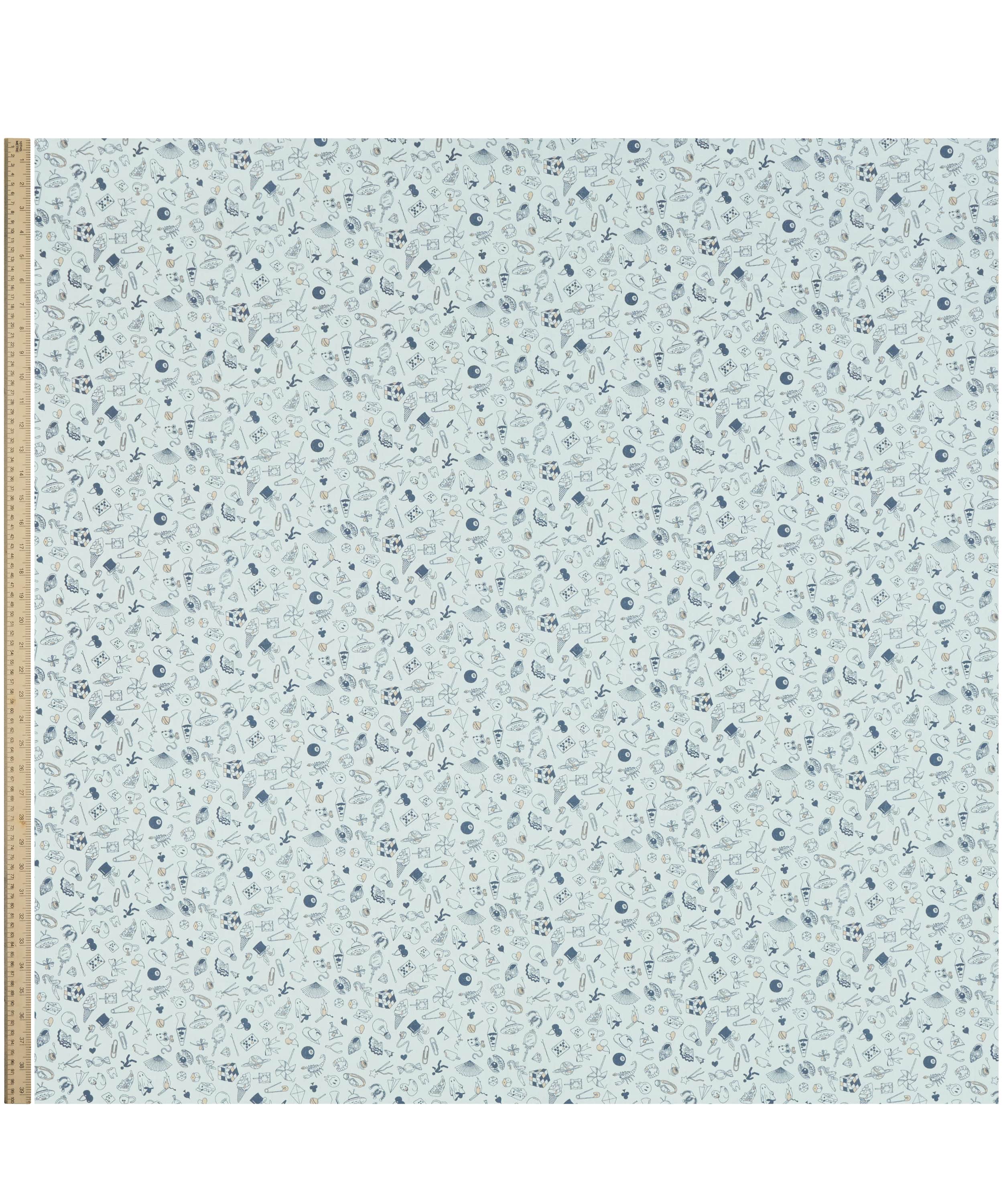 タトゥーアーティストのフラッシュシートにインスパイアされた楽しいカンバセーショナルデザインです。リバティデザインスタジオでファインライナーペンを使って作成されたこのパターンは、グラフィックのディテールの中に鮮やかな色彩が加わりさらにデザインを引き立てています。よく見ると、ラヴァランプ、サイコロ、惑星、クリップ、電球、さらにはバナナの皮といったユニークなオブジェクトの遊び心あふれる、まさにランダムさの無限の集まりです。
