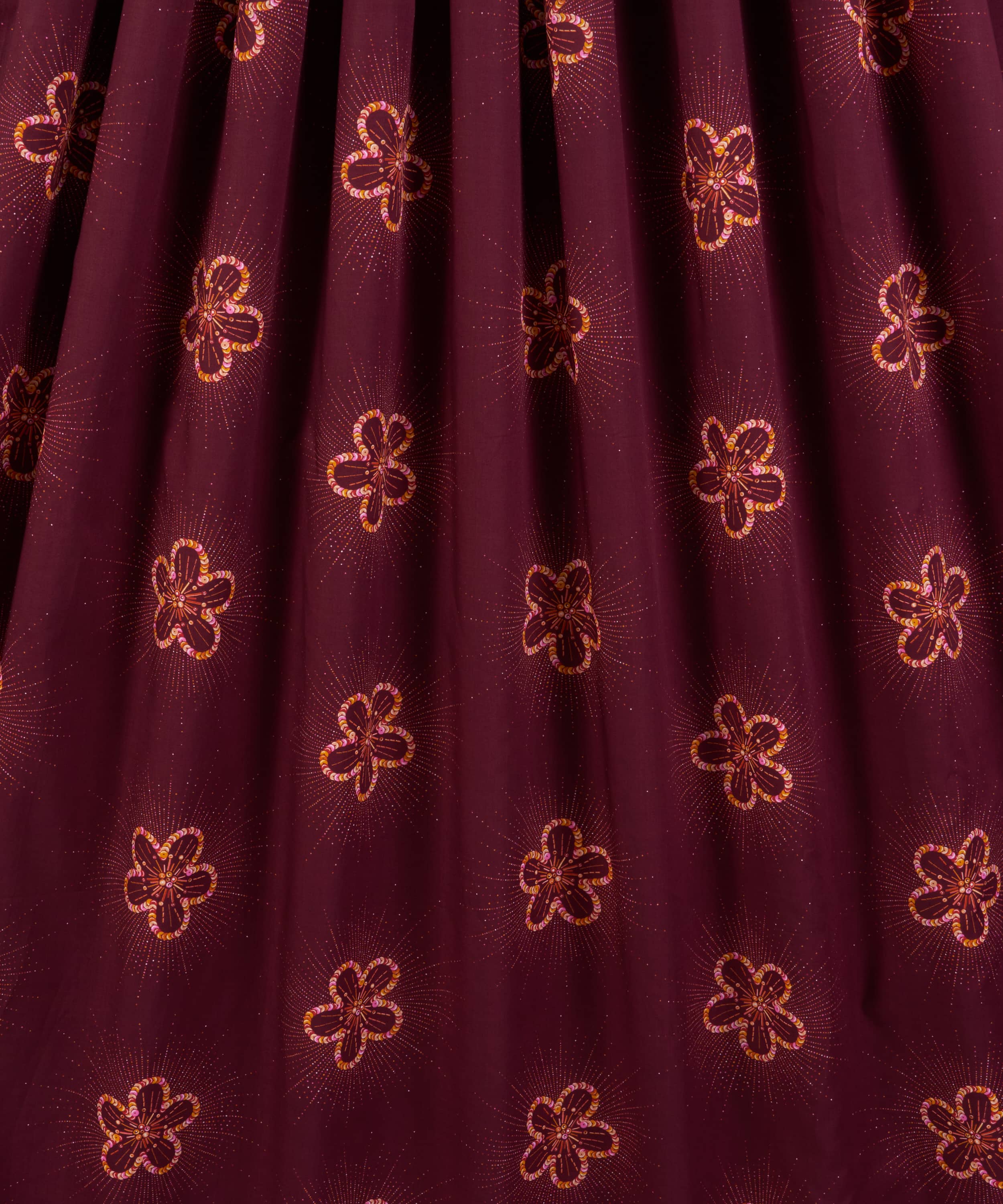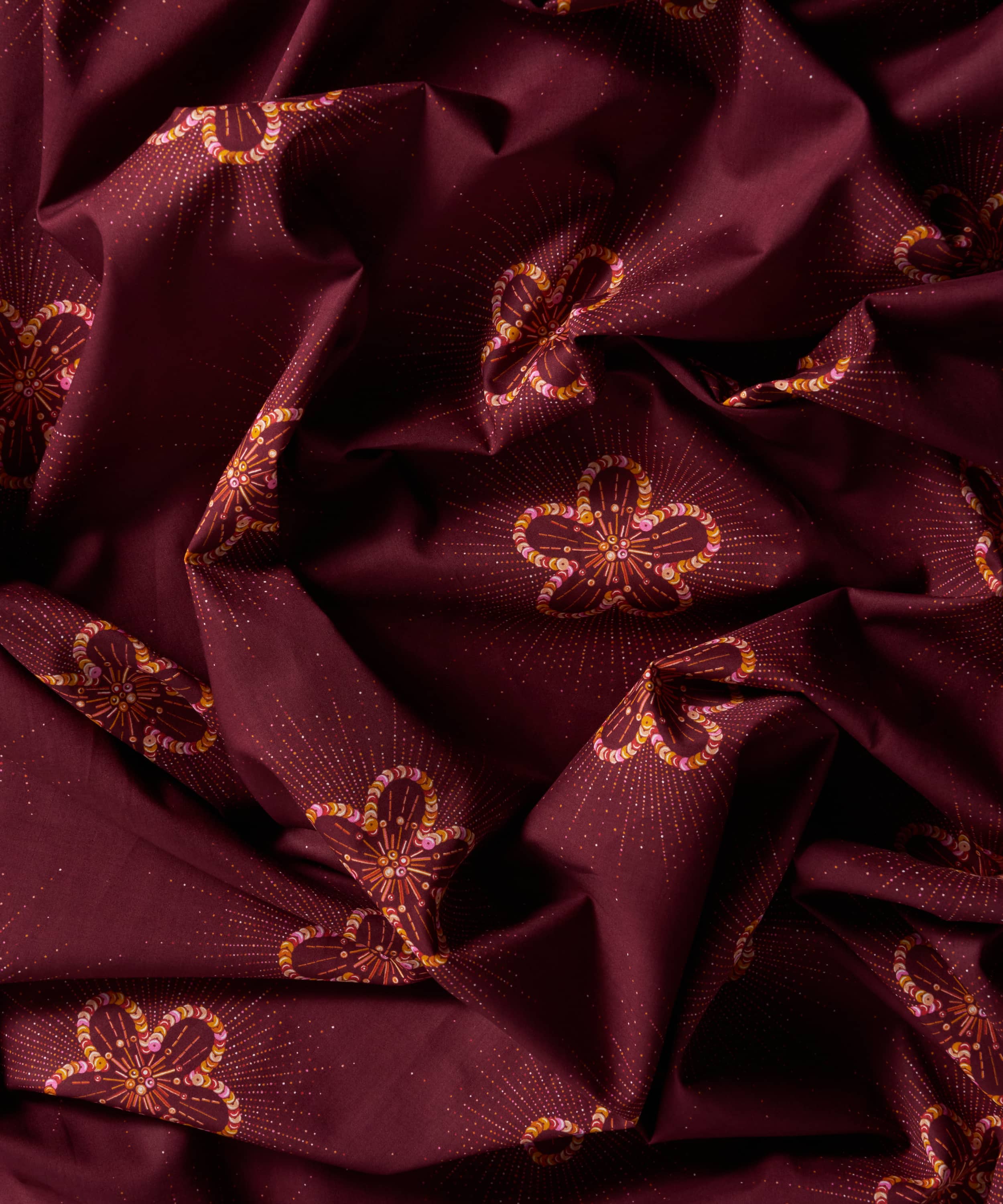 1910年代から1920年代に伝統的な制約から解放された若い女性たち、いわゆるフラッパーたちが髪をボブにし、スパンコールやビーズ、タッセルで飾られた短いドレスを着ていた時代にインスパイアを受けたこのデザインは、ガッシュで手描きされ、星のように輝く花のヘッドが暗い色の背景に散りばめられています。華やかなフラッパードレスの豪華な魅力を呼び起こす一枚です。