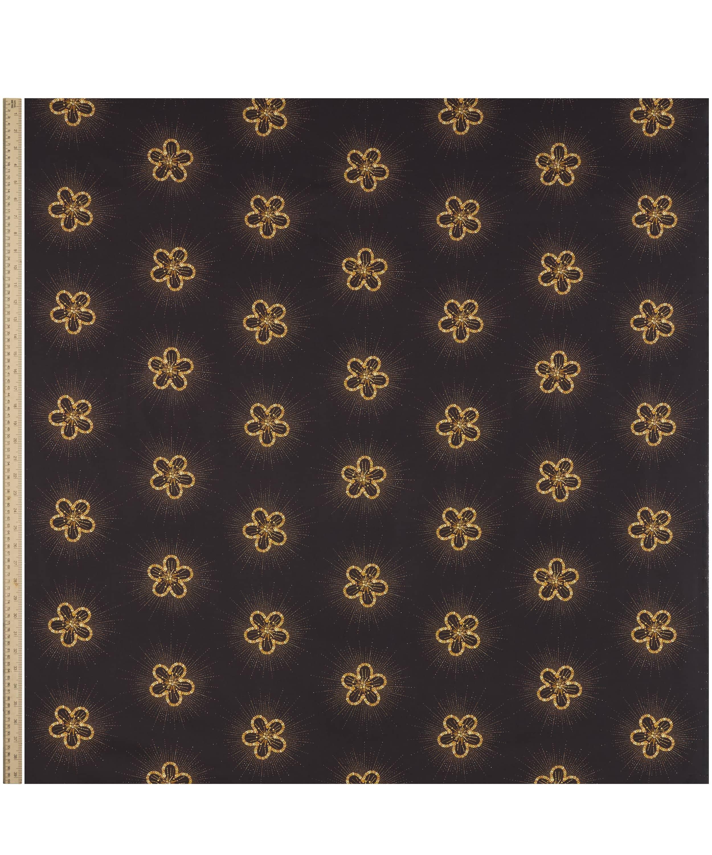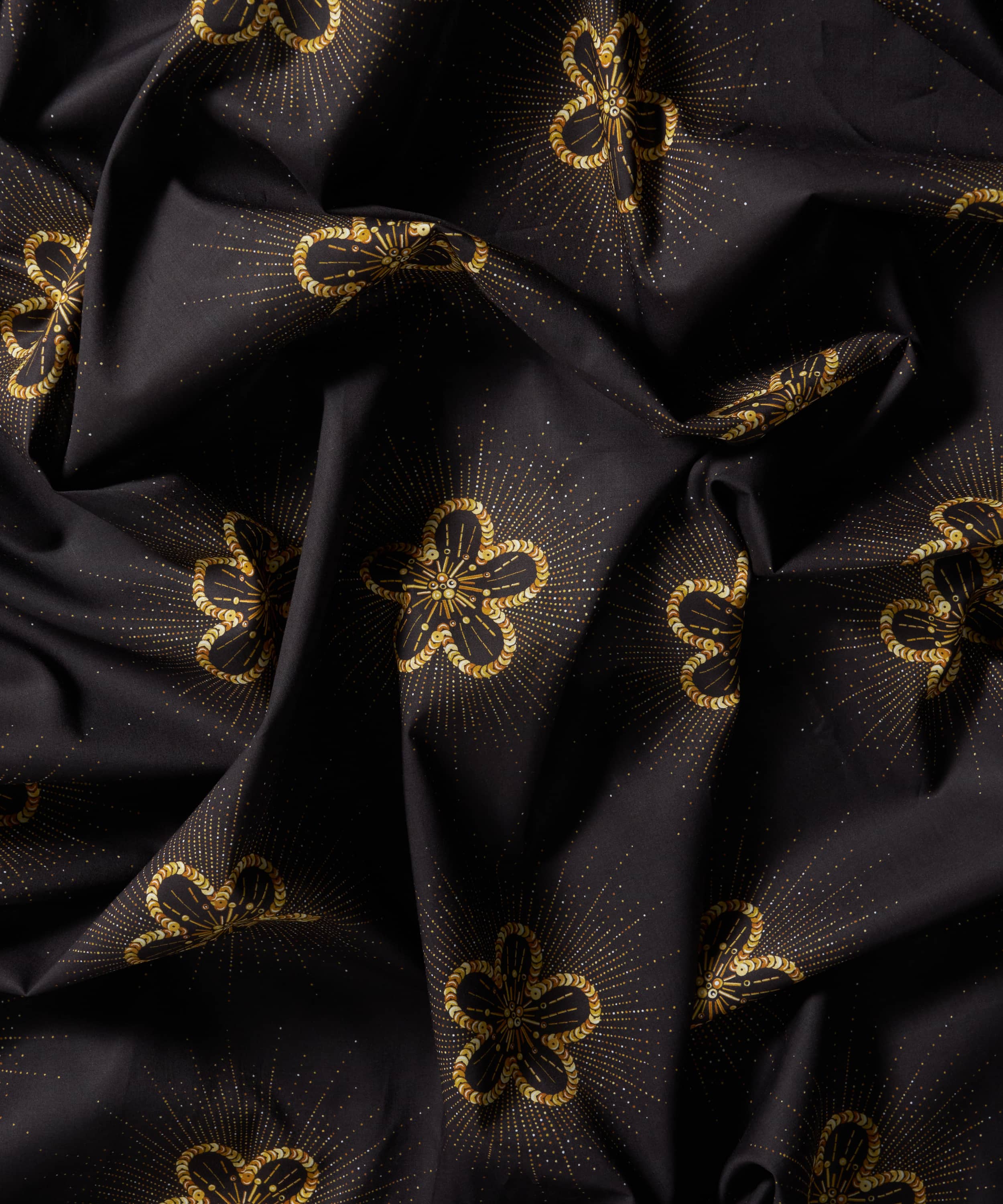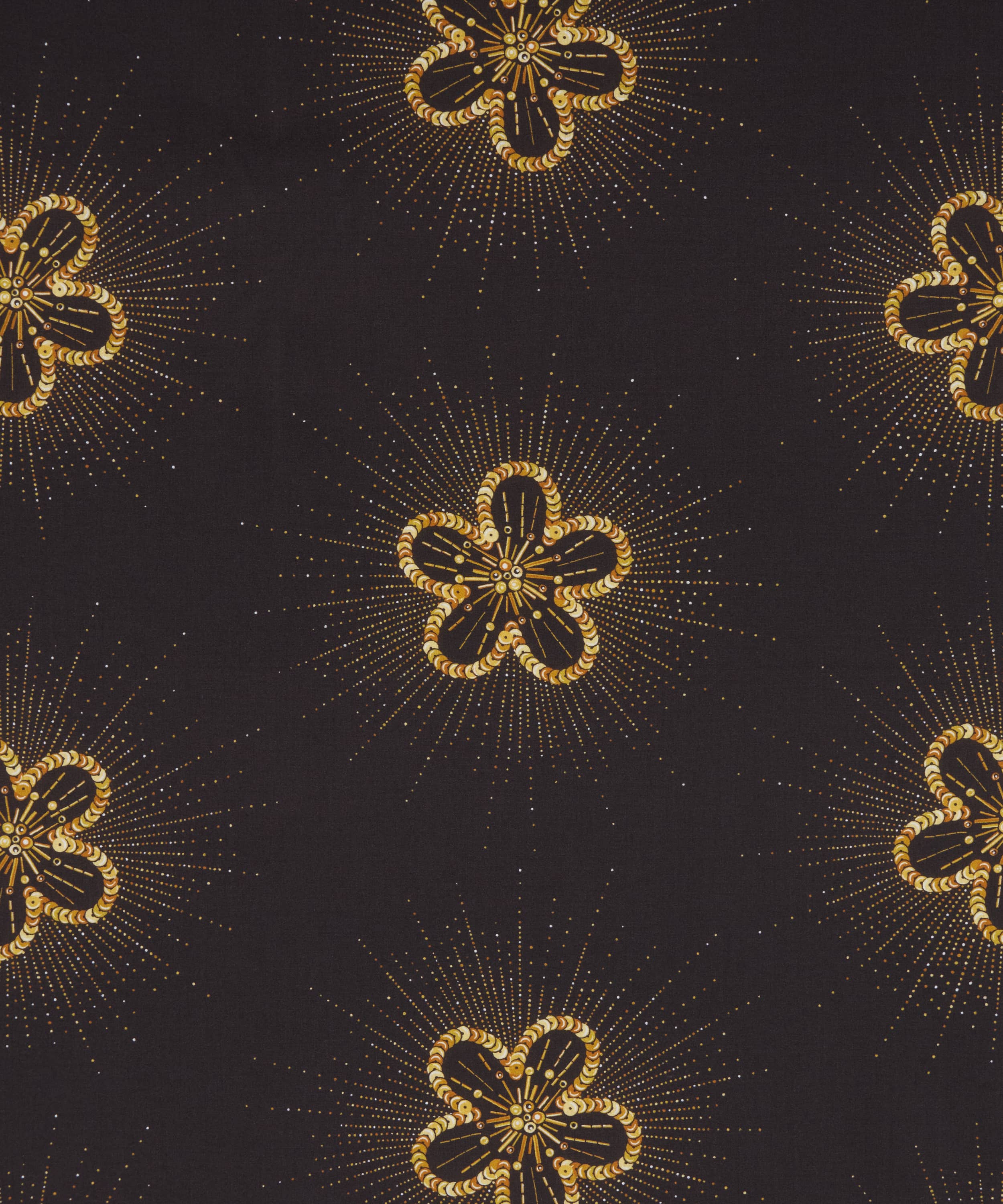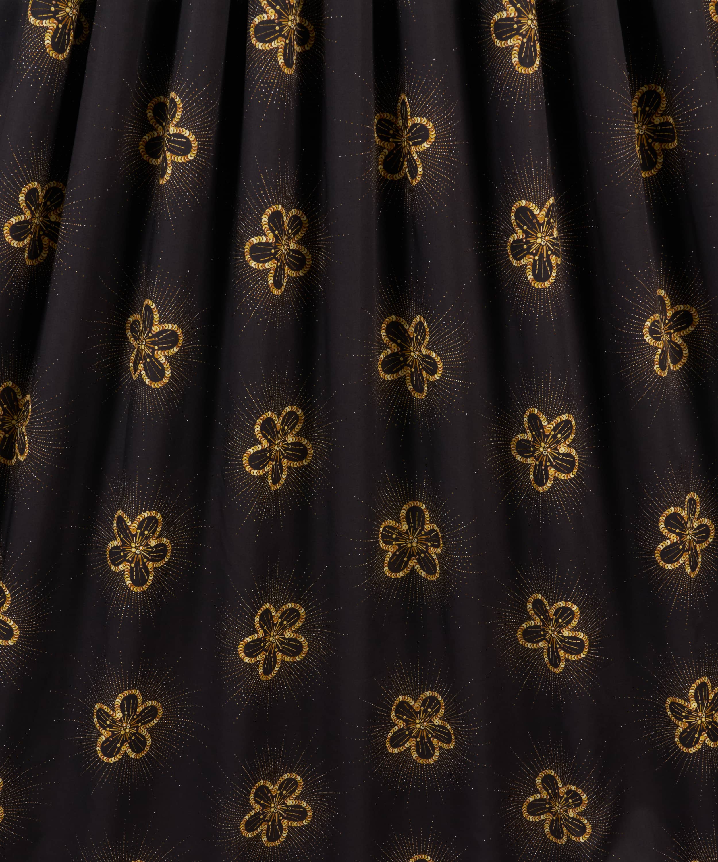 1910年代から1920年代に伝統的な制約から解放された若い女性たち、いわゆるフラッパーたちが髪をボブにし、スパンコールやビーズ、タッセルで飾られた短いドレスを着ていた時代にインスパイアを受けたこのデザインは、ガッシュで手描きされ、星のように輝く花のヘッドが暗い色の背景に散りばめられています。華やかなフラッパードレスの豪華な魅力を呼び起こす一枚です。
