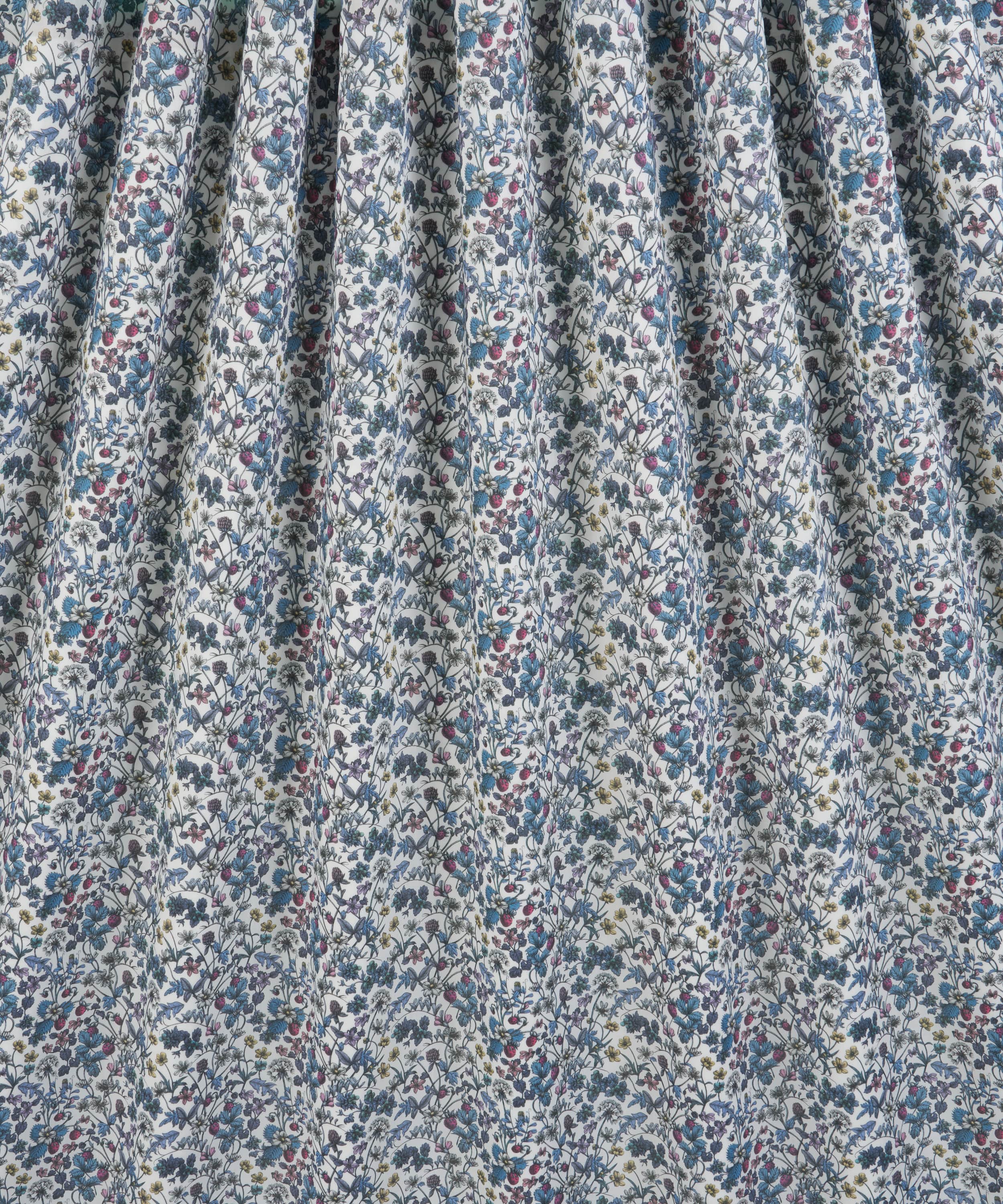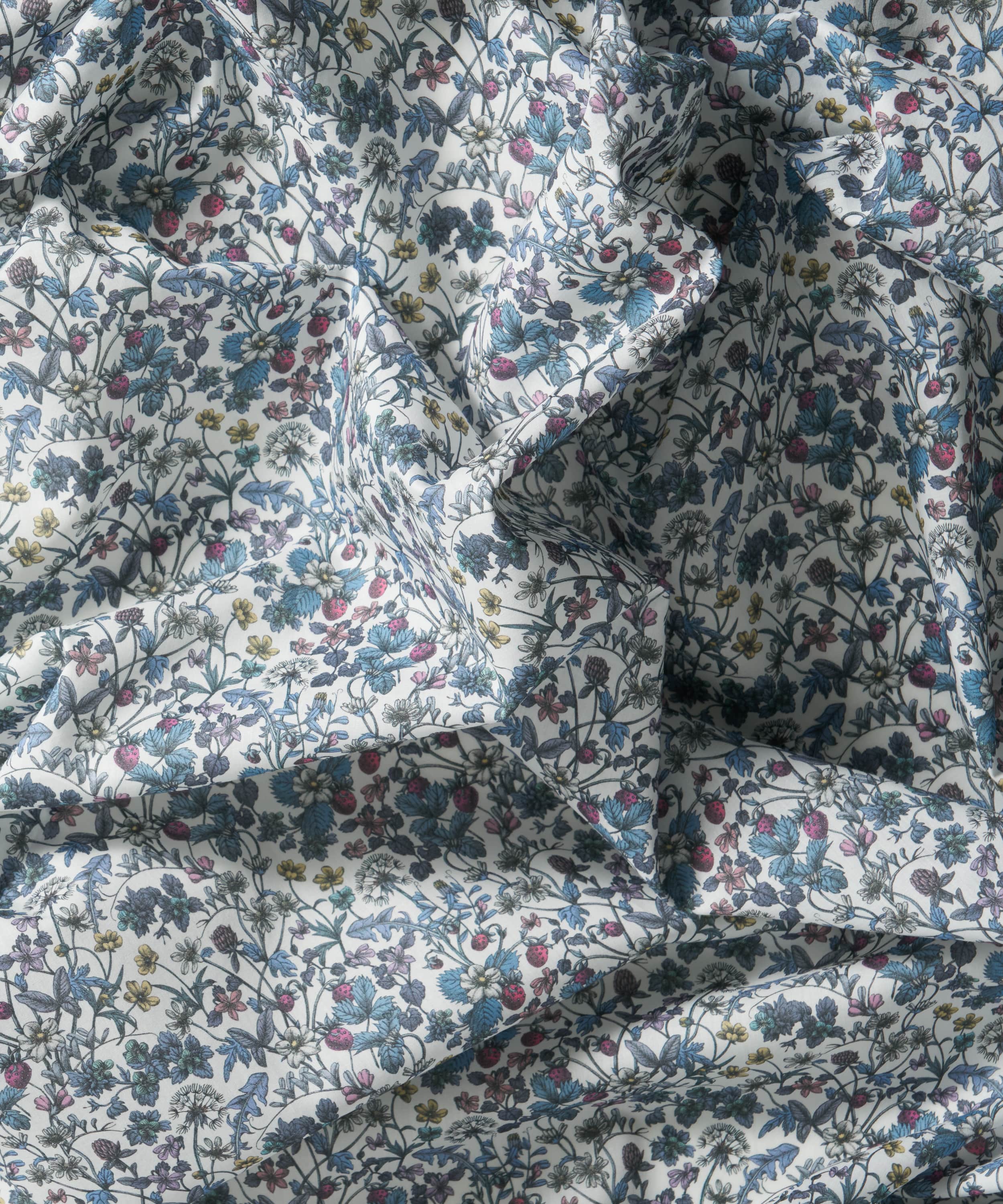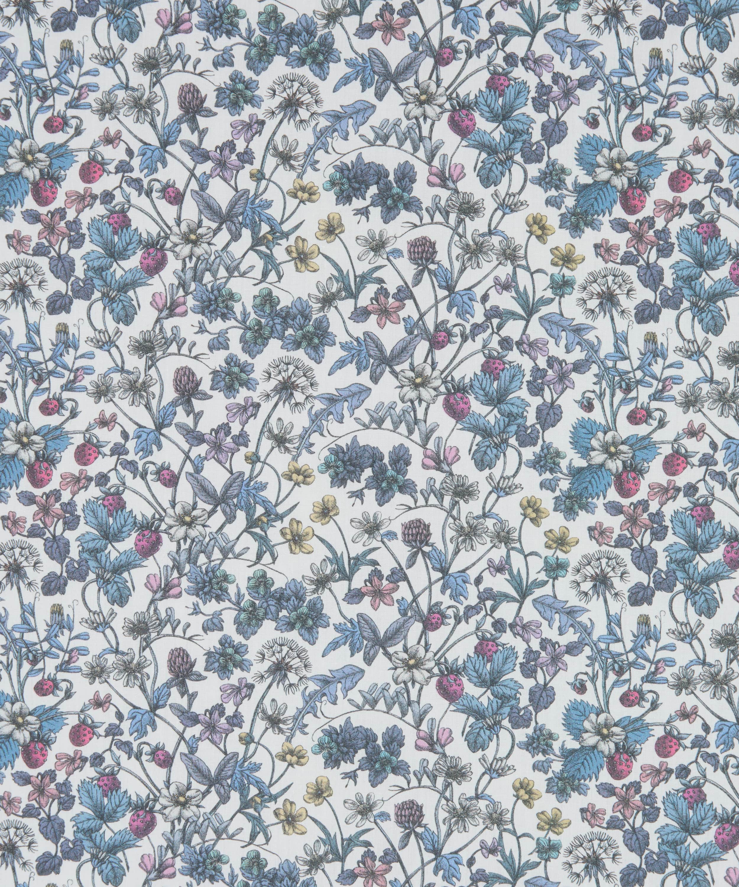 「スプリング・メモリーズ」の花のモチーフの一部を取り入れた、遊び心あふれるコーディネート柄です。花咲く草原に身を委ね、自然の生命力と静かな調和に包まれる、のびやかで心地よいひとときを想起させます。やわらかな鉛筆の濃淡によって繊細に手描きされた構成の中には、豊かな野花の庭が広がり、デイジーやキンポウゲ、クローバー、スミレ、タンポポ、ワスレナグサが咲き誇る風景の中に、熟したストロベリーがさりげなく描き込まれています。