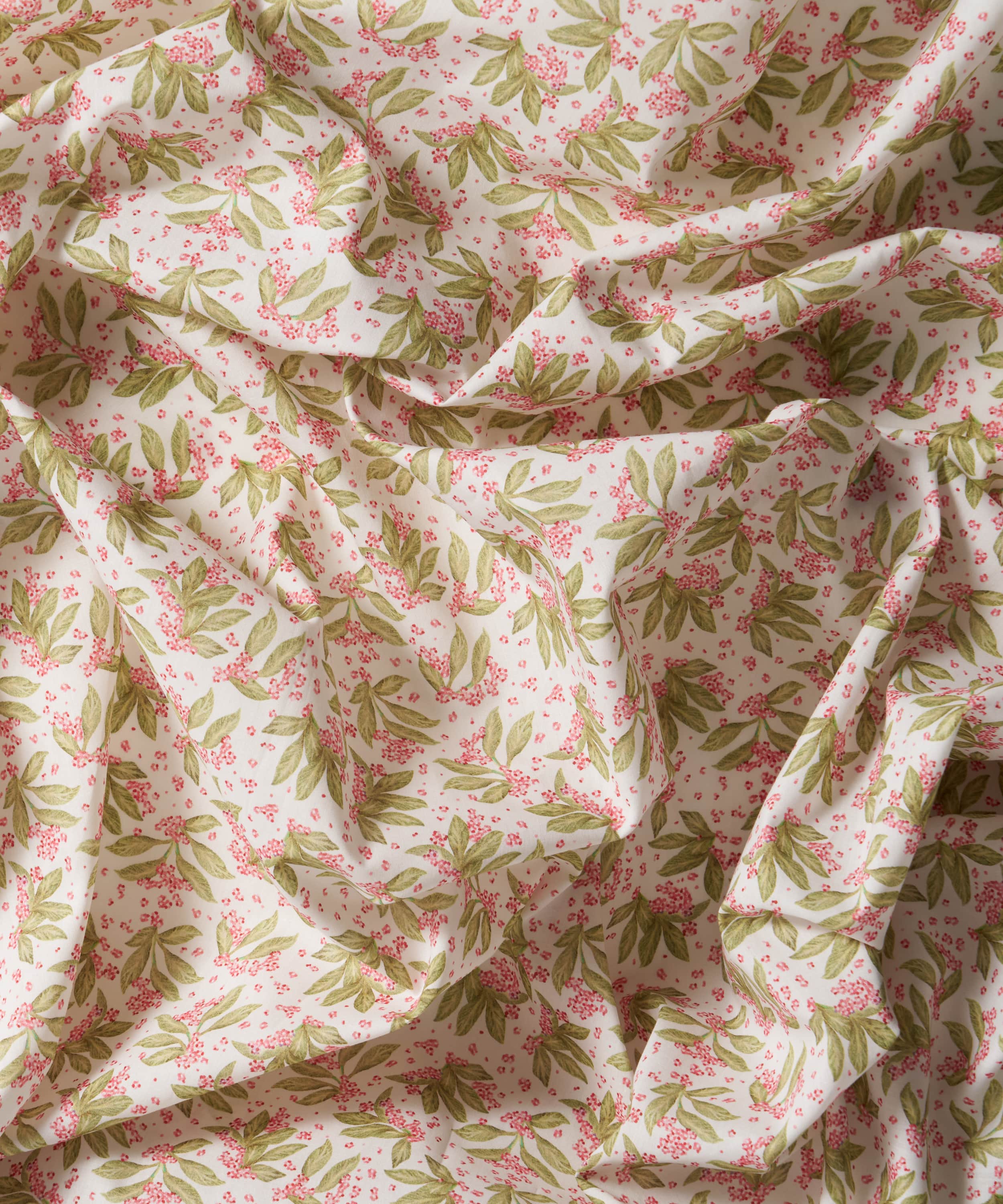 舞うように広がるボタニカルモチーフが、布一面に表情豊かに散りばめられた「ポーセリン・キャノピー」。リバティのスタジオで手描きされたこのデザインは、多方向に構成された葉の流れと、きらめくように描かれたワスレナグサが印象的です。陶芸家フェリシティ・エイリフの繊細な水彩表現から着想を得ており、軽やかさと奥行きを併せ持つ佇まいを生み出しています。明るいカラーパレットからシックなダークトーンまで、美しく映える、汎用性とタイムレスな魅力を備えたデザインです。