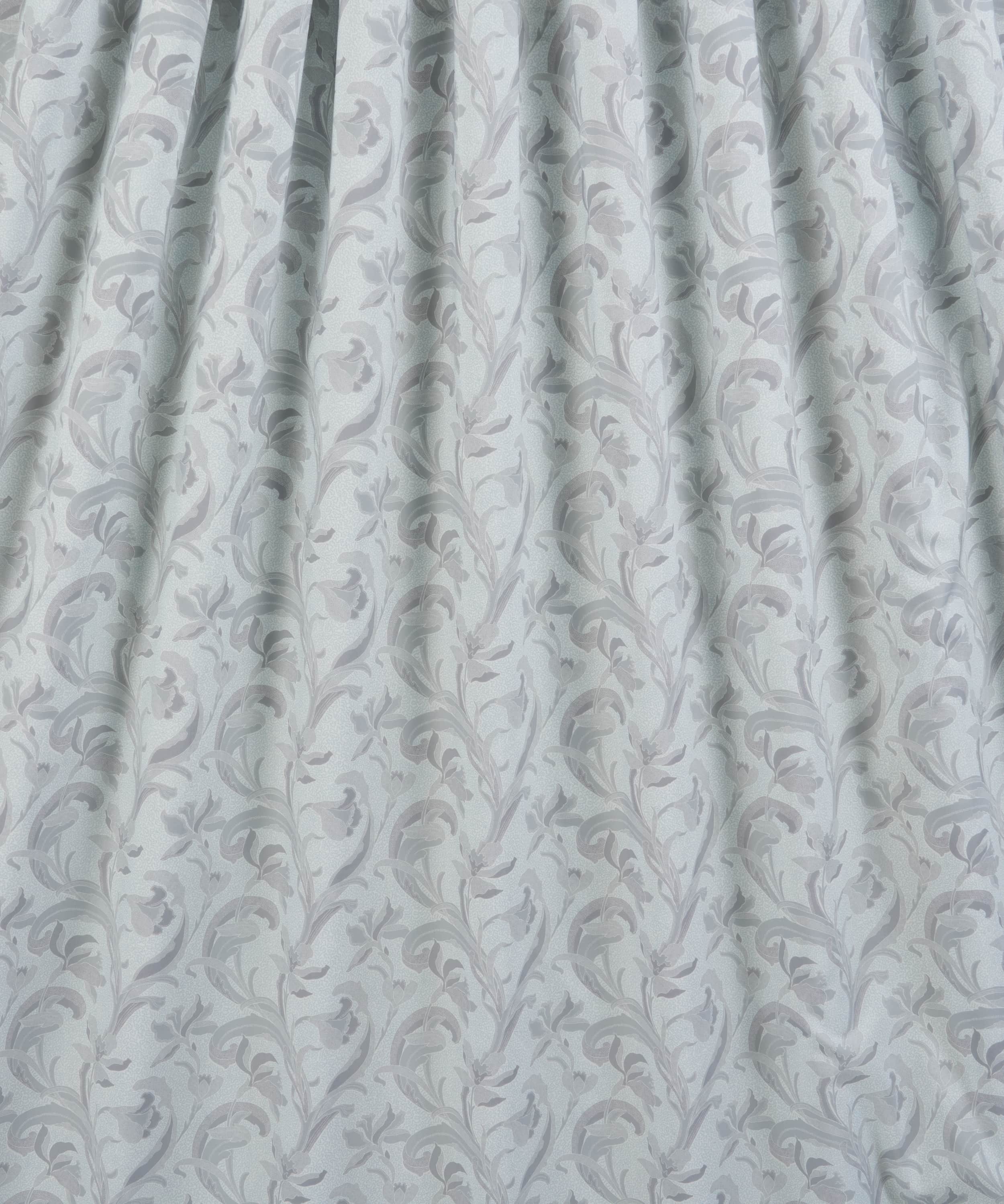 リバティのアーカイブで発見された手描き作品をもとに、同名の歴史ある陶磁器の伝統に着想を得た「セラドン」。細部に至るまで丁寧に描き直し、配色を刷新することで、装飾性に満ちた豊かな表情が引き出されています。様式化されたスイセンと流れるような葉のモチーフが、アール・ヌーヴォーを思わせる優雅さで、しなやかな縦のラインを描きながら立ち上がります。さらに、繊細な線で描かれたスクイグル状の地模様が、さりげない奥行きと質感を添えています。
