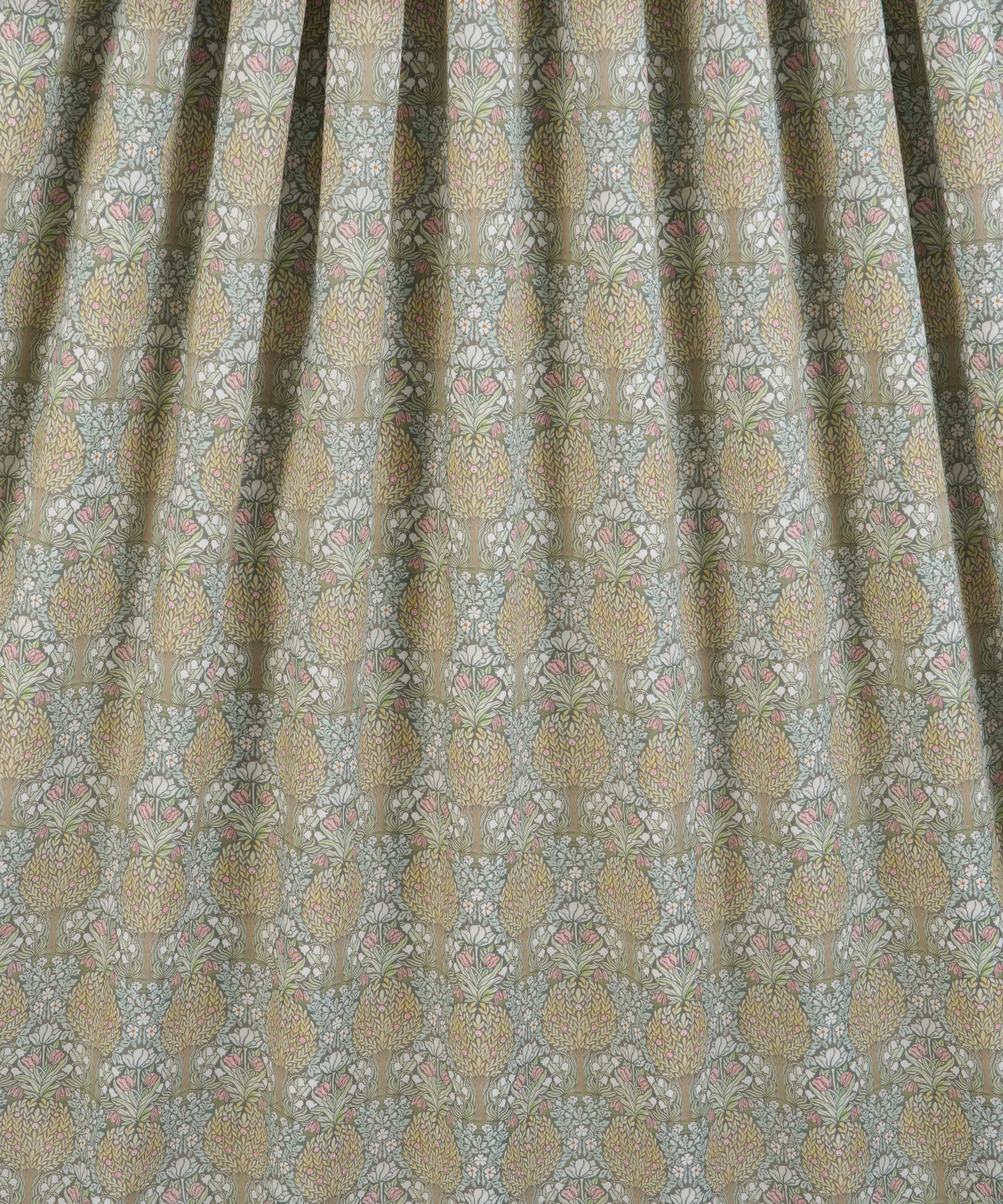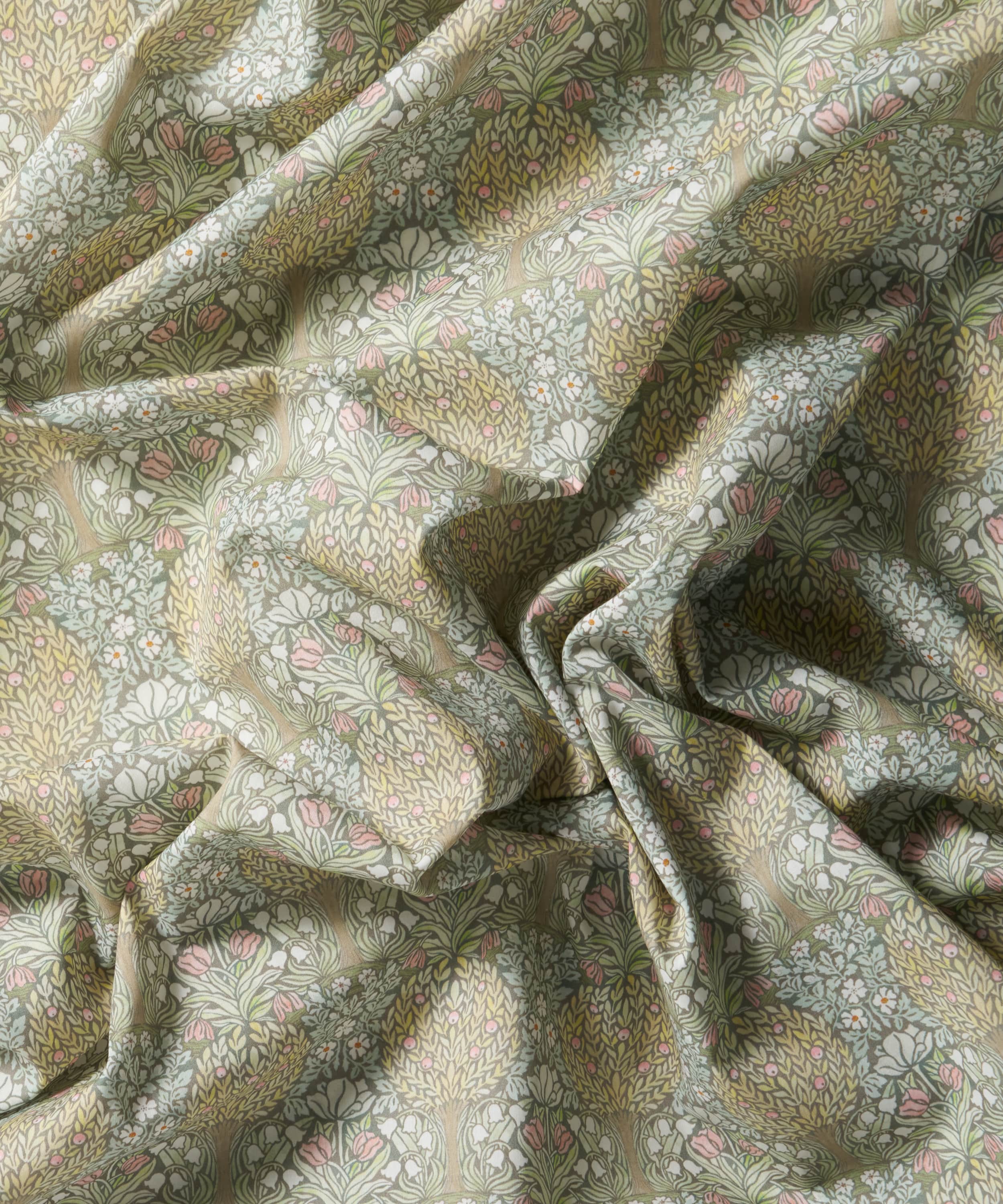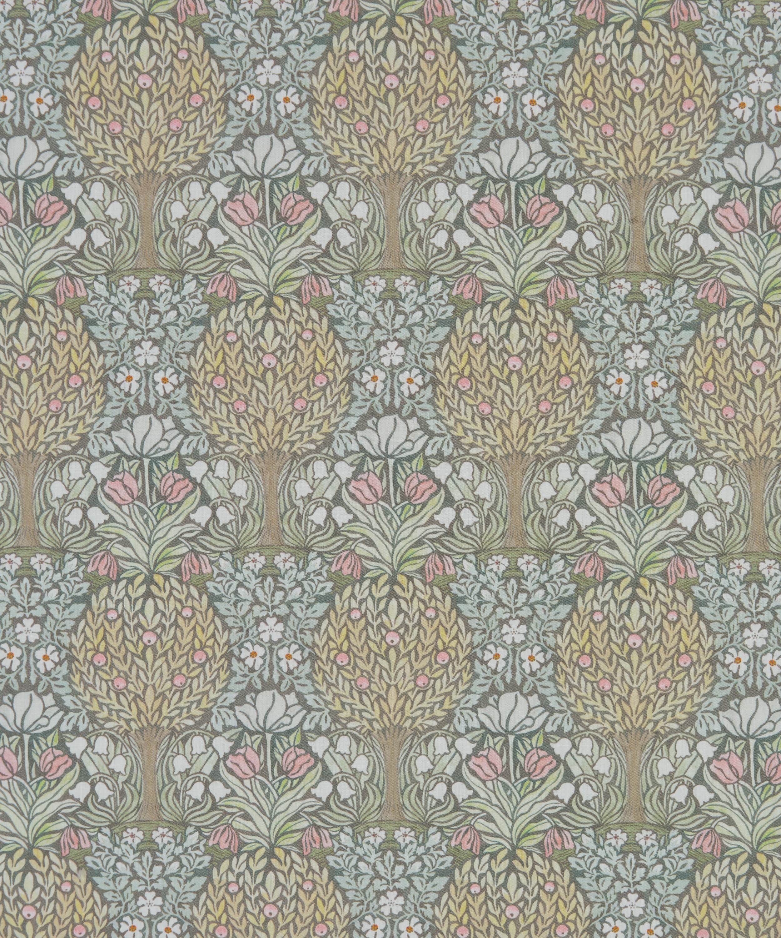 リバティのアーカイブで発見された手描き作品を起点とする、アール・ヌーヴォーの魅力を色濃く映した「ハンリー・フォレスト」。様式化された果樹や花々が、左右対称の構成で広がり、密度の高いグラフィカルな表情を生み出しています。ムーアクロフト陶器に通じる独自のスタイルとの親和性からセレクトされ、繊細な水彩で描き起こすことで、大胆な線描をやわらかく和らげ、全体に心地よいバランスをもたらしています。