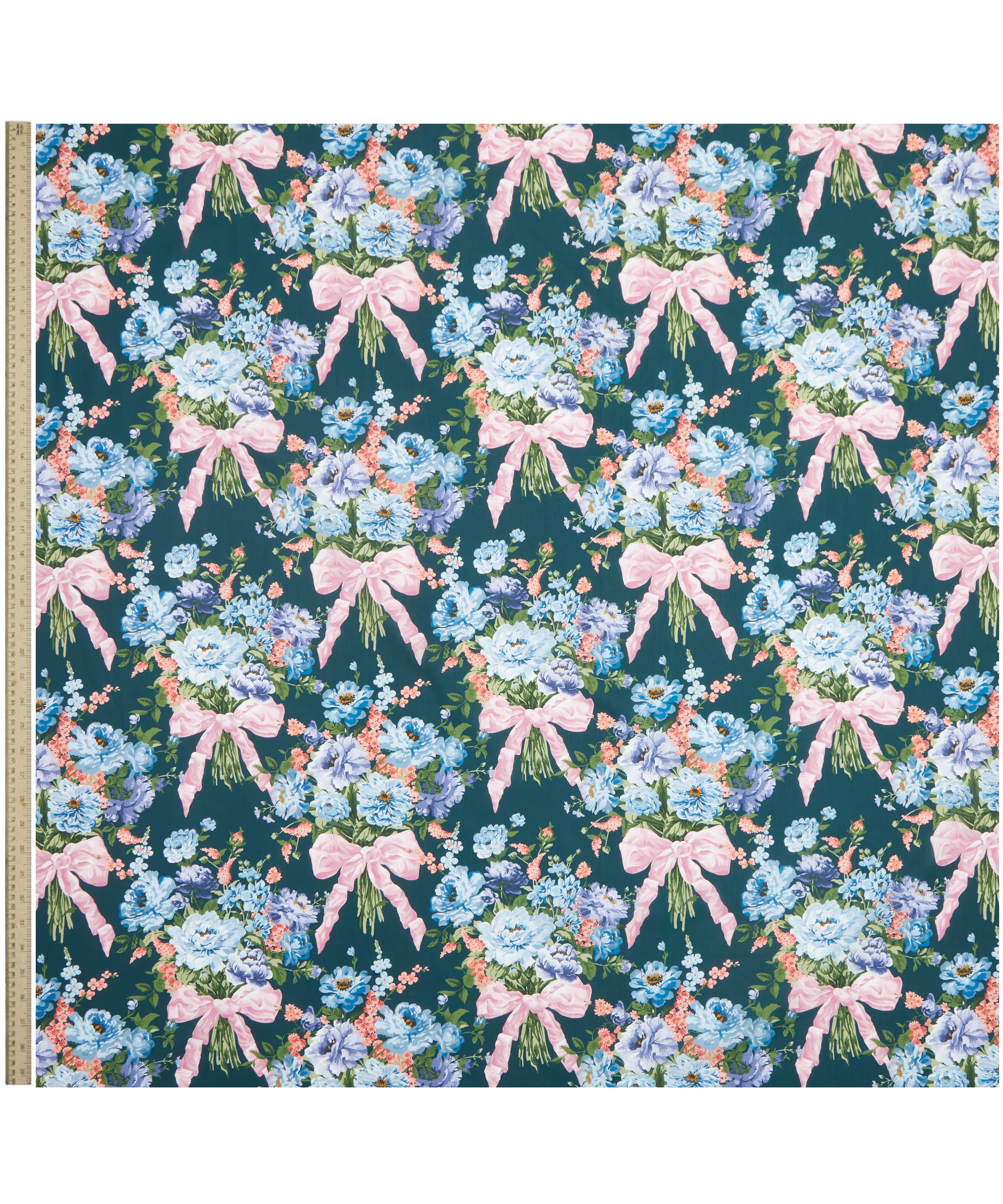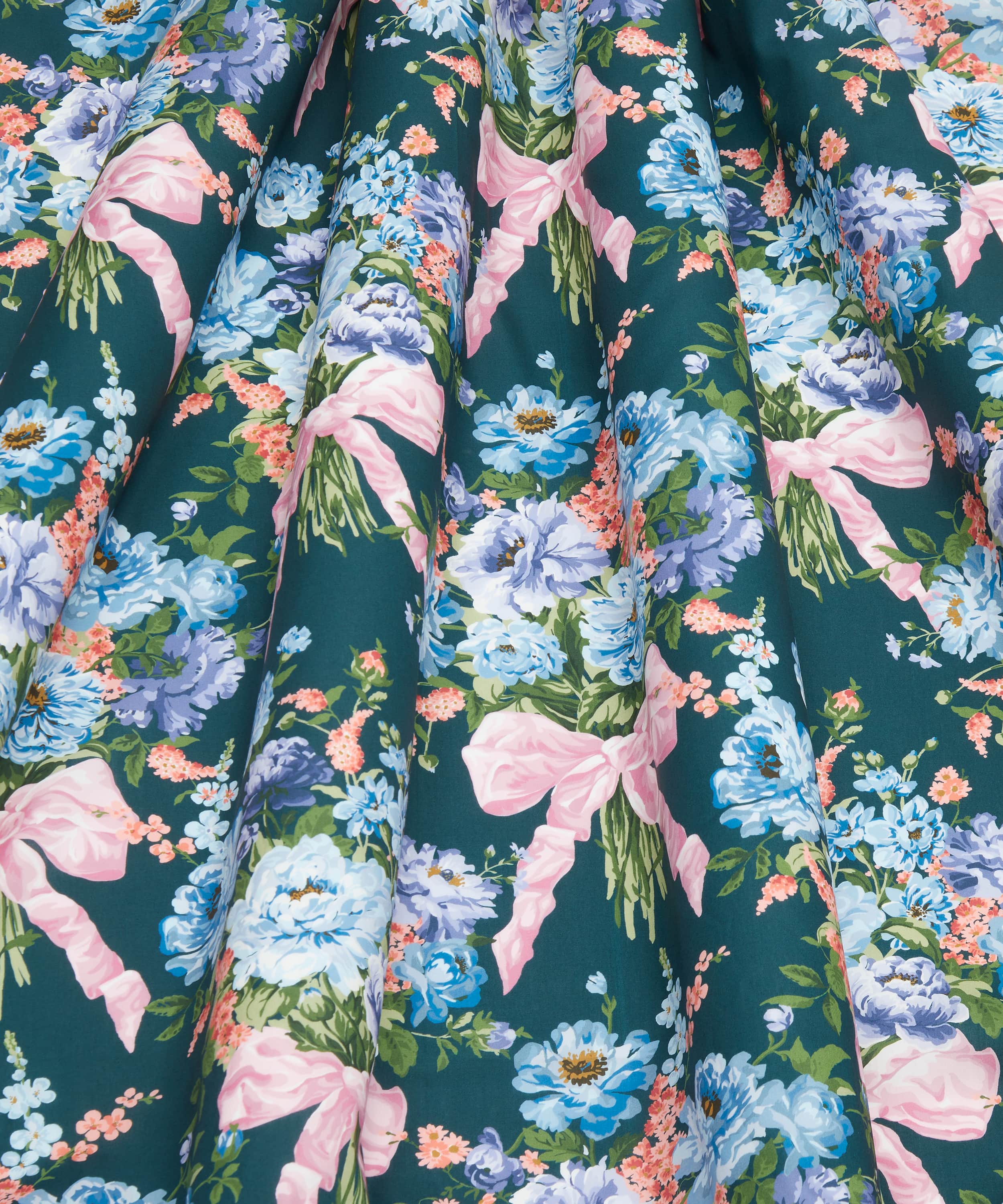リバティのアーカイブから見出された複数のボタニカルプリントを組み合わせて構成された「ボウ・ブーケ」は、自然が織りなす色彩の多様さとその美しさを称えるデザインです。リージェンシー期の壮麗さを想起させる演出のもと、ローズ、ピオニー、アスター、ライラック、ヒエンソウが配され、シルクサテンのリボンで優雅に束ねられた、印象的なブーケを描いています。深みのある色調の背景により花々が際立ち、宝石のような色彩が強調されることで、奥行きと視覚的なコントラストが加えられています。