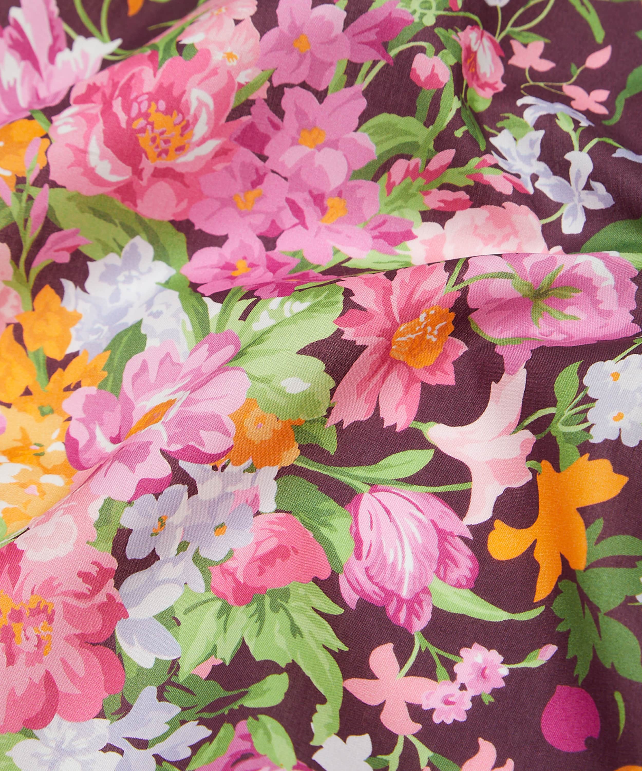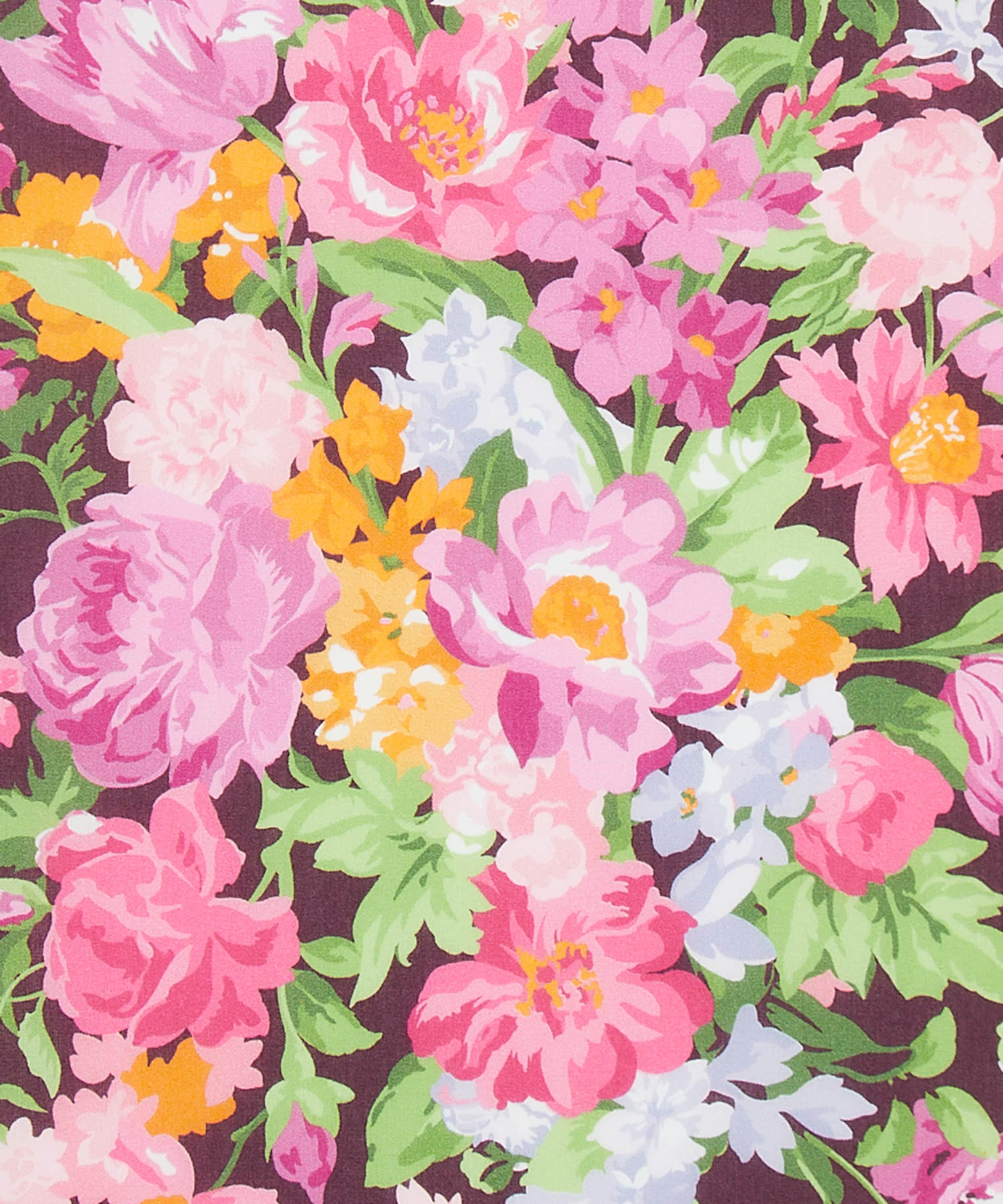ローズ、アネモネ、チューリップ、デルフィニウム、リリー、カメリアが咲き重なり、華やかで躍動感のあるフローラルの世界を描き出しています。鮮やかな色彩とフォルムに満ちた「ブーケ・カーニバル」は、リバティのタイムレスなアーカイブ作品に着想を得て、新鮮な構成へと昇華されたデザインです。丁寧に構成されたブーケにフォーカスした、深みのある色調が印象的なこのダイナミックなプリントは、フォーマルなソワレからガーデンパーティまで華やかなシーンを演出します。