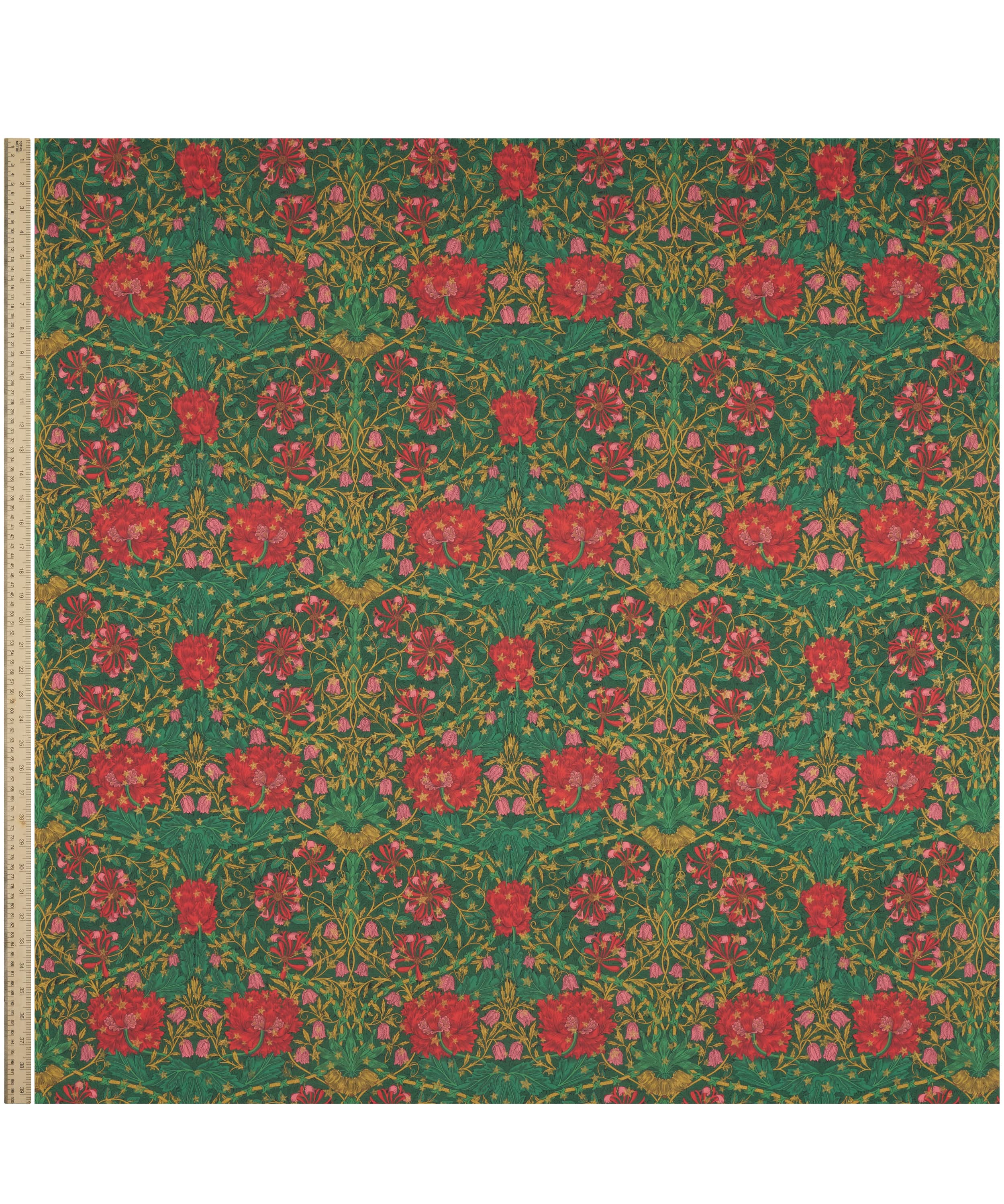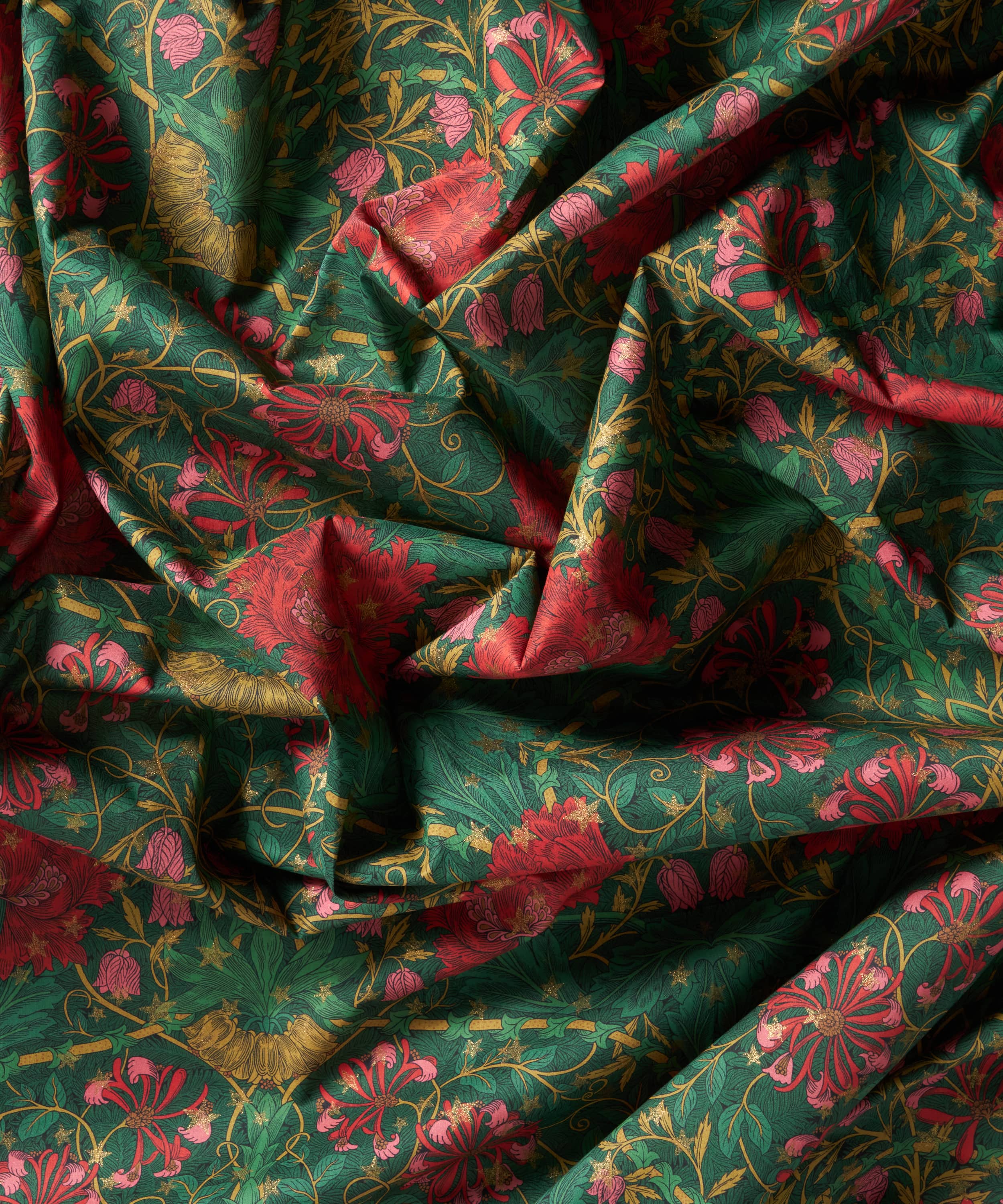 ウィリアム・モリスが1876年に手がけた人気のプリント「ハニーサックル」に着想を得たリバティの伝統的な宝物「マーチ」。フェスティブシーズンに向けて再解釈された「マーチ・スパークル」は、チューリップや咲き誇るハニーサックル、緻密で豊かな葉の流れを描いた花模様の上に、繊細なメタリックの星をあしらっています。時代を超えて愛される魅力と、アーツ&クラフツならではの洗練された美しさを兼ね備えたこの壮麗なパターンは、自然の美しさを称えるデザインです。