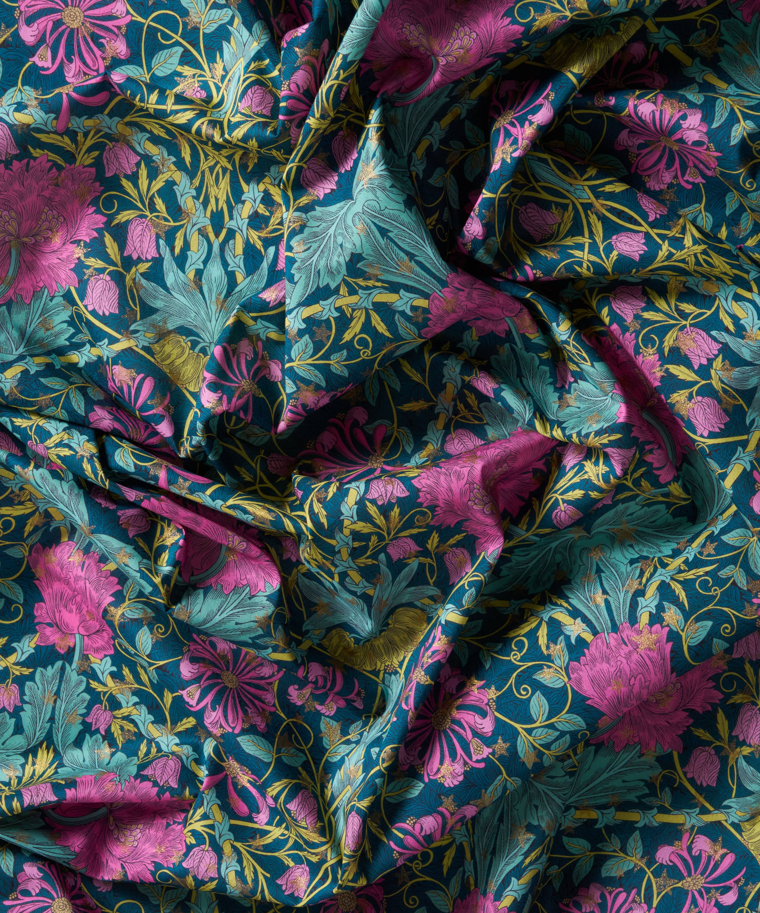 ウィリアム・モリスが1876年に手がけた人気のプリント「ハニーサックル」に着想を得たリバティの伝統的な宝物「マーチ」。フェスティブシーズンに向けて再解釈された「マーチ・スパークル」は、チューリップや咲き誇るハニーサックル、緻密で豊かな葉の流れを描いた花模様の上に、繊細なメタリックの星をあしらっています。時代を超えて愛される魅力と、アーツ&クラフツならではの洗練された美しさを兼ね備えたこの壮麗なパターンは、自然の美しさを称えるデザインです。