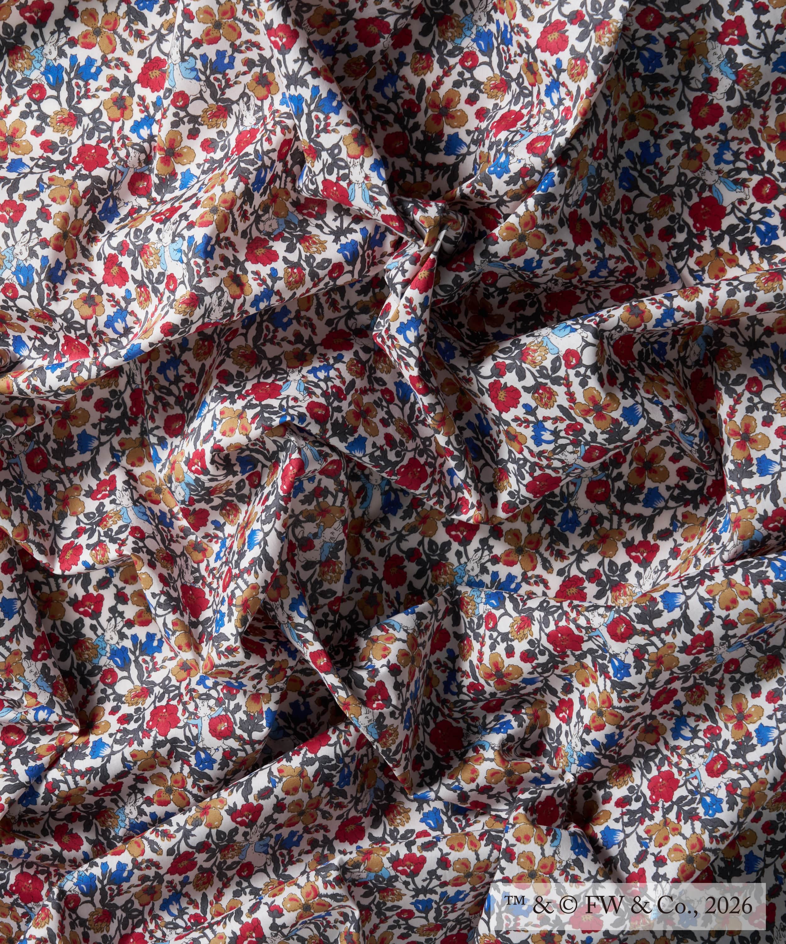 野生の草原に咲く花々に隠れているキャラクターをよーく見てください。そう!ピーターラビット(TM)です。イングリッシュガーデンに咲くポピーやブルーベルを楽しく表現した1930年代の象徴的なこのデザインは、30年以上にわたりクラシック・コレクションに加入していました。(C)FW&Co.,2026