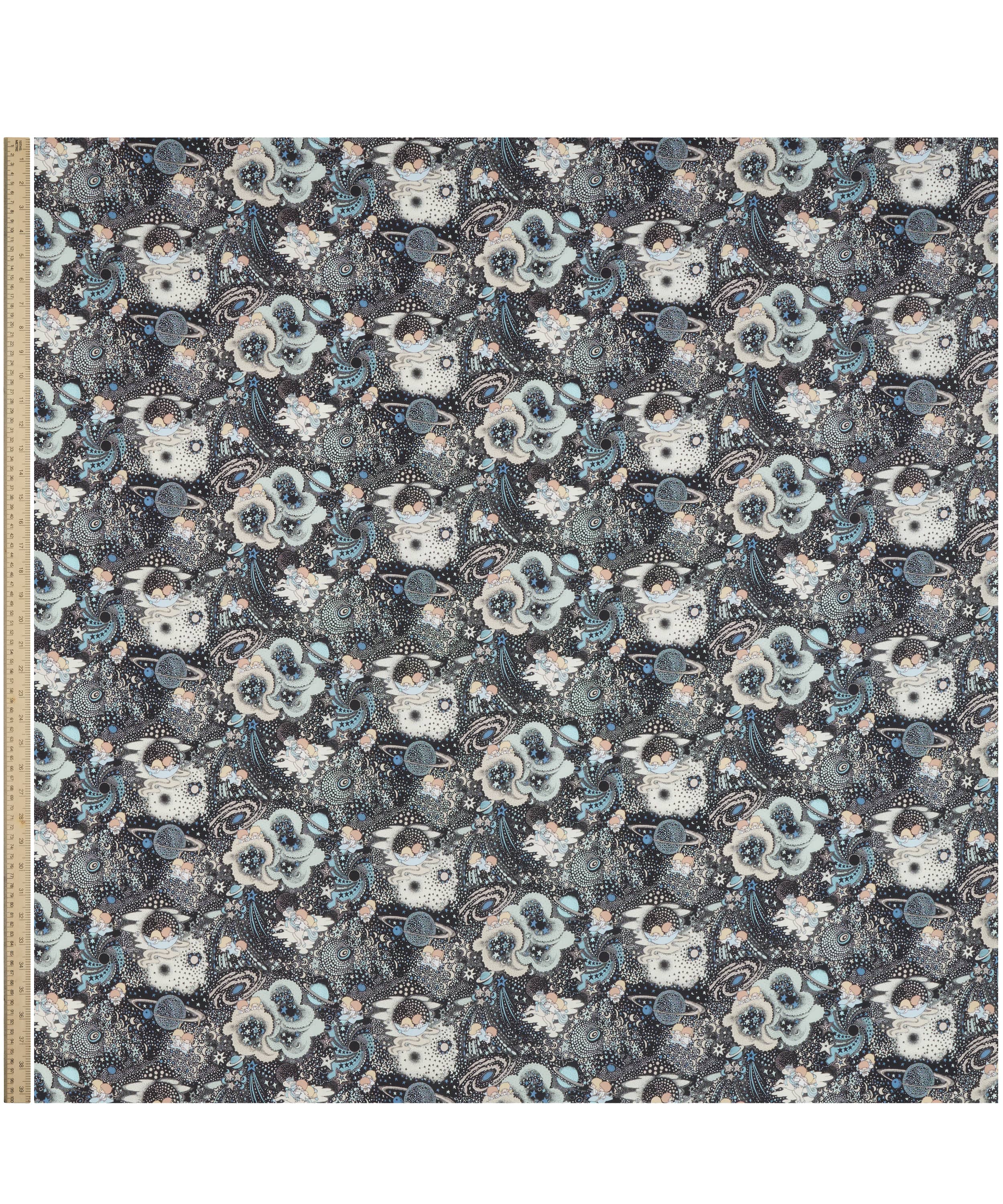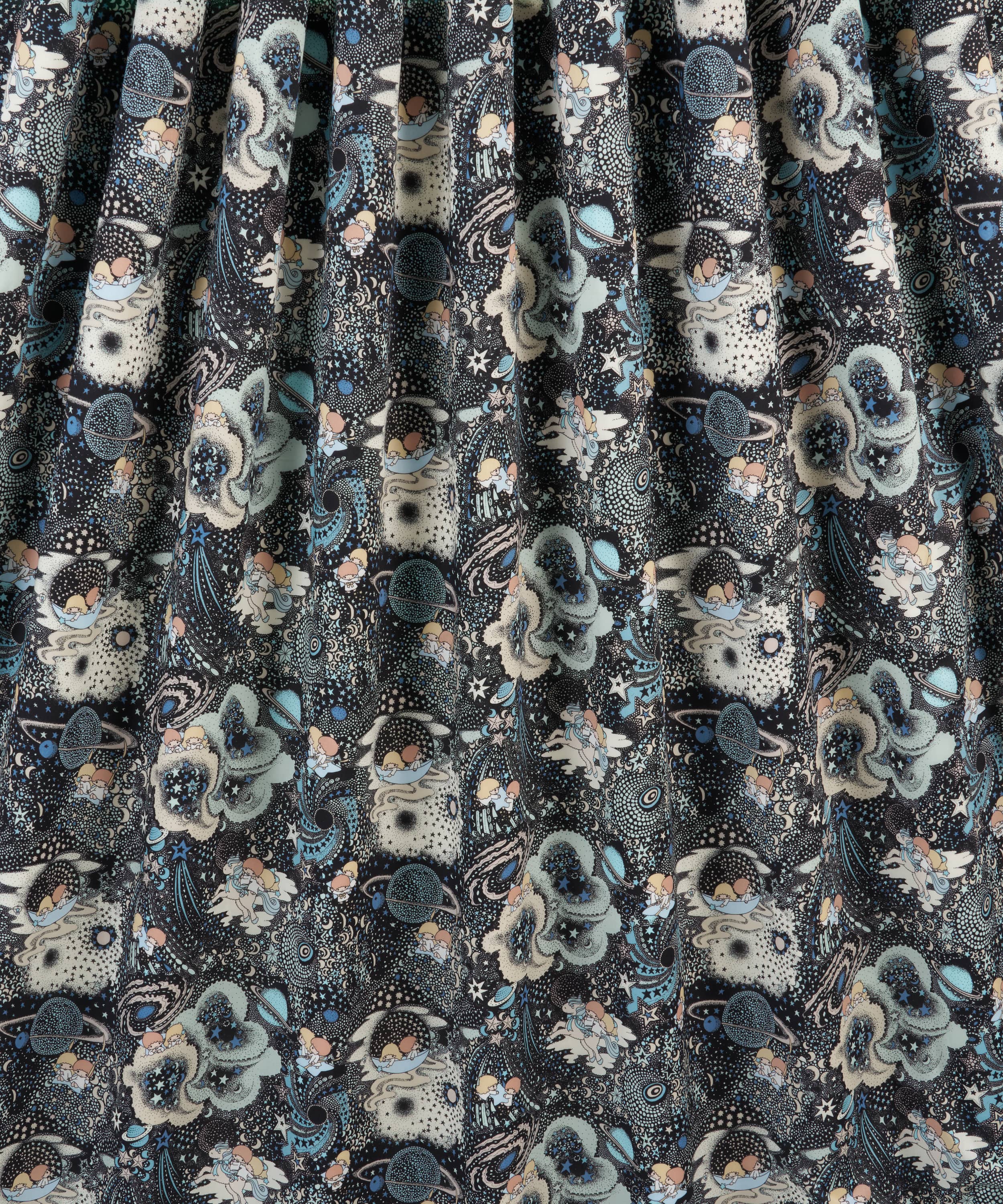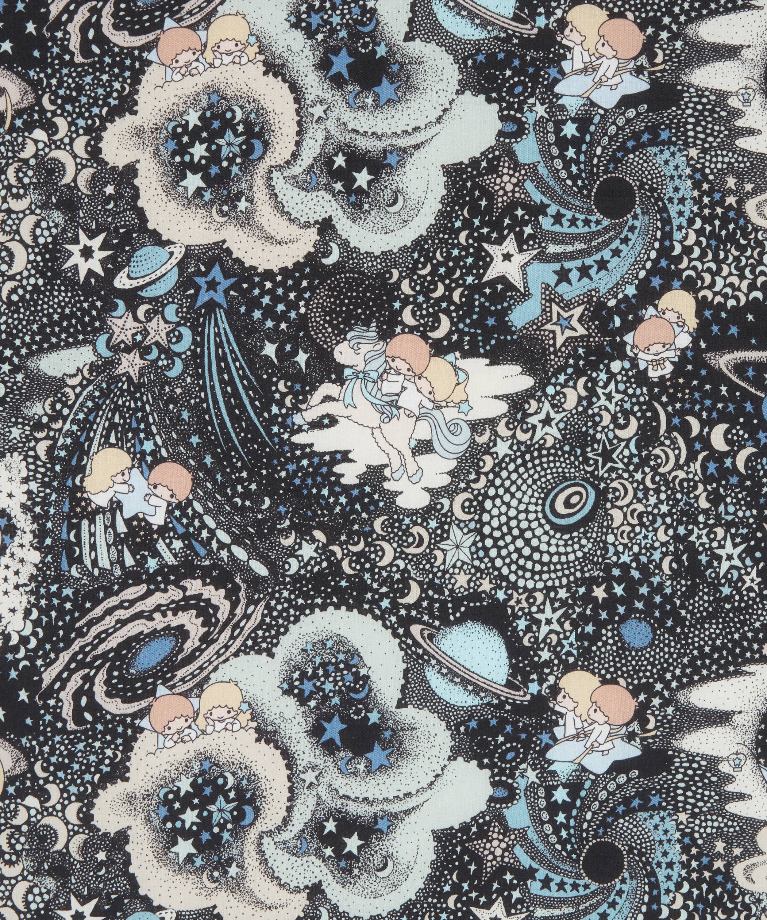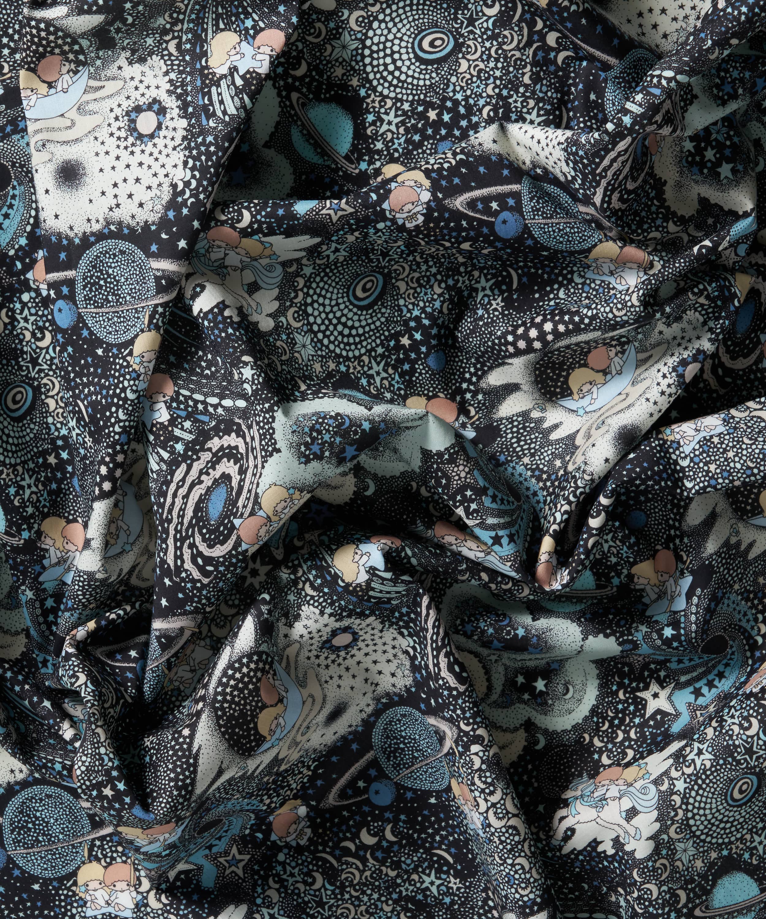 輝く彗星や光る月、踊る惑星、渦巻く彗星のきらめきや月の光、惑星のリズム、銀河のうねりが重なり合い、キキとララの夢のような宇宙の旅を美しく表現しています。ユニコーンに乗り、高く舞い上がる二人は、光と動きに満ちた果てしない宇宙を飛び回ります。繊細なラインで手描きされた原画に、水彩の柔らかな色調を重ねた、リバティらしい幻想的なデザインです。